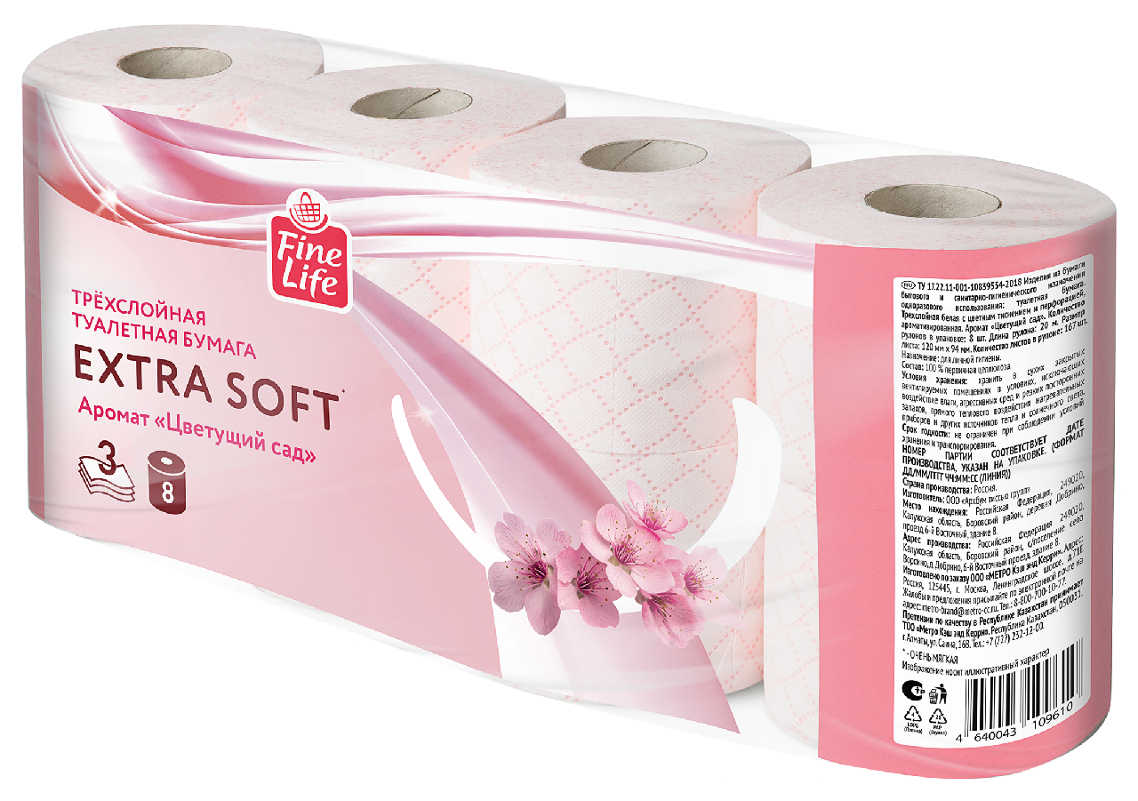 Fine Life Туалетная бумага Extra Soft Цветущий сад трехслойная 8 рулонов