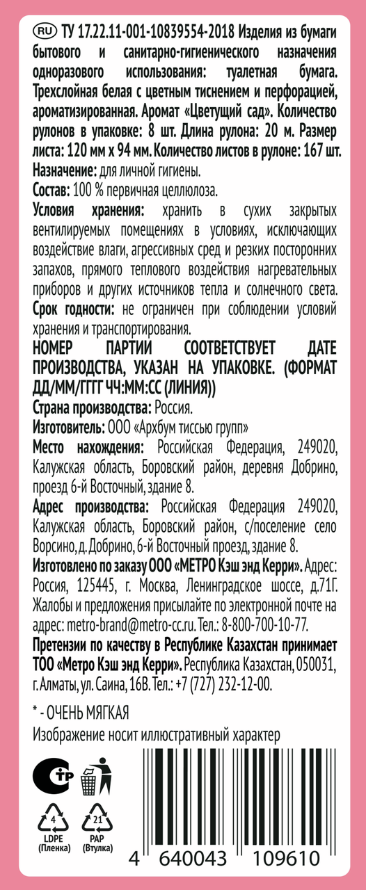 Трехслойная туалетная бумага из 100% целлюлозы. С цветным тиснением и перфорацией. Ароматизированная. Аромат Цветущий сад. Упаковка оснащена перфорацией для легкого открытия.