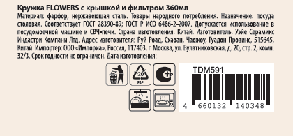 Кружка Flowers 360мл - фарфоровая кружка с цветочным принтом, которая комплектуется крышкой и фильтром для заваривания чая. Подходит для использования с горячими напитками, что делает ее отличным выбором для любителей чая.