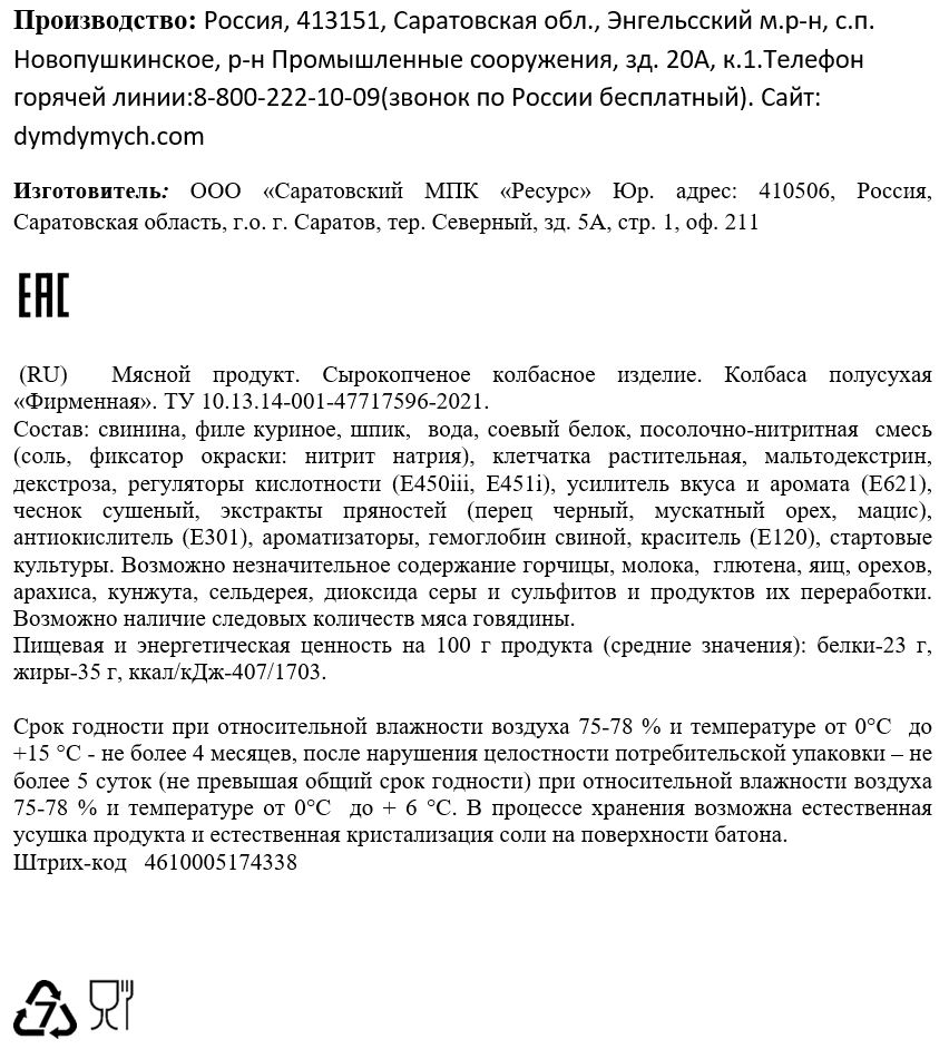 Колбаса Дым Дымыч Фирменная сырокопченая