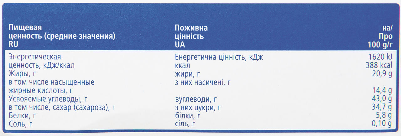 Яйца, сахар, шоколад (22%) (сахар, какао-масса, какао-масло, эмульгатор: соевый лецитин, ароматизатор: ваниль), вода, масло (содержит молоко), кокосовое масло, пшеничная мука, какао-порошок (2%), цельное сухое молоко.