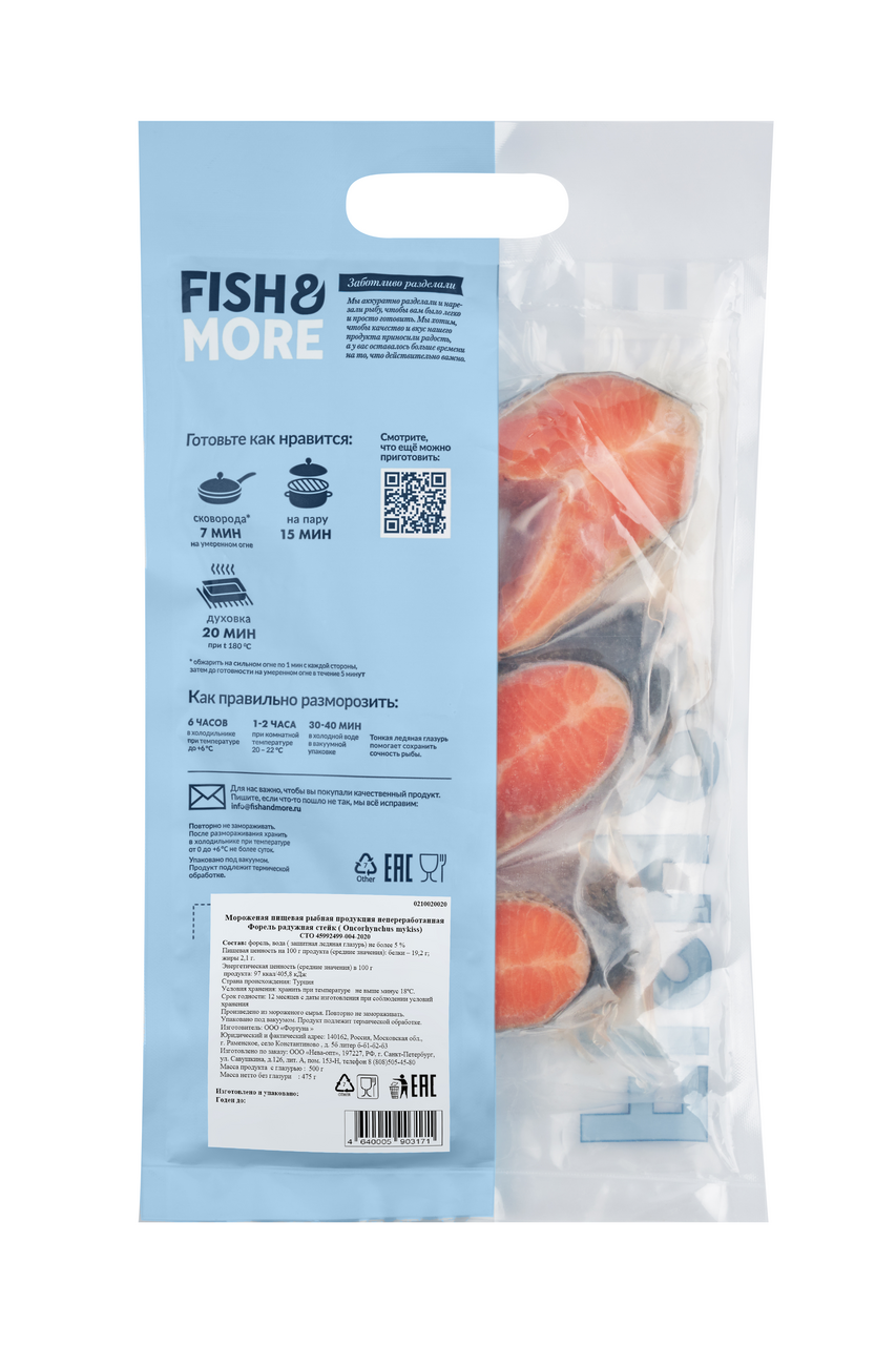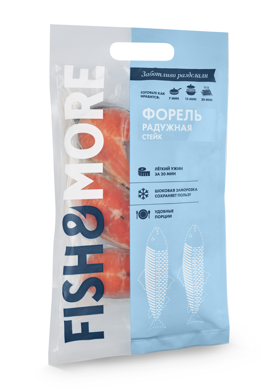 Форель - достойная альтернатива лососю. Представлена в виде стейков. Мясо нежное и сочное, с меньшим по сравнению с лососем содержанием жира (3-7%). Считается диетической рыбой. Богата Омега-3 жирными кислотами, является источником лекгоусвояемого белка, витаминов и минералов. Шоковая заморозка сохраняет свежесть и сочность мяса, а тонкий слой ледяной глазури и вакуумная упаковка - презентабельный внешний вид. Отлично подходит для жарки, запекания и приготовления на гриле.