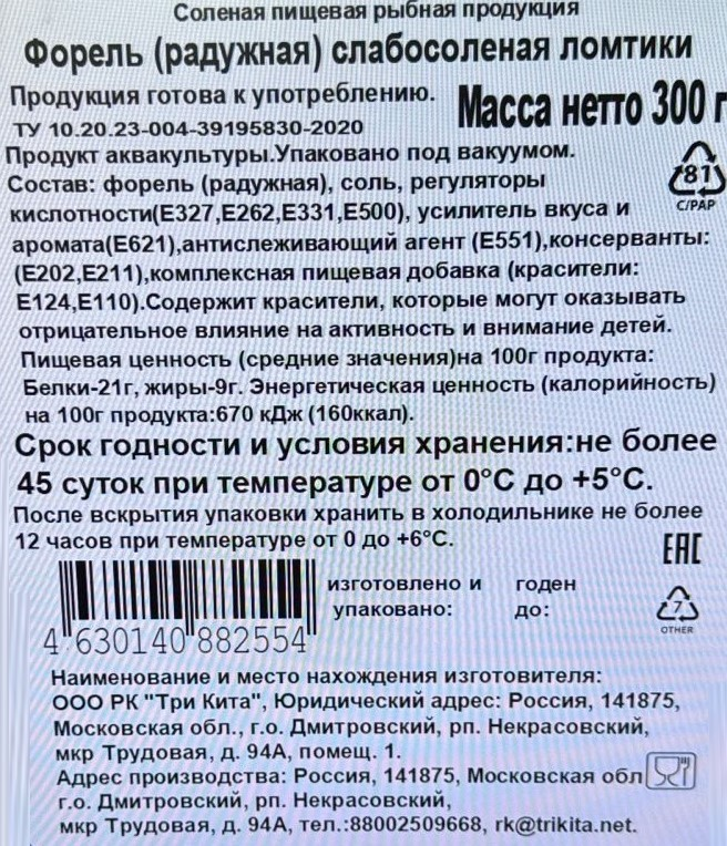 Форель радужная, соль, регуляторы кислотности Е327, Е262, Е331, Е500, усилитель вкуса и аромата Е621, антислеживающий агент Е551, консерванты: Е202, Е211, комплексная пищевая добавка красители Е124, Е110.