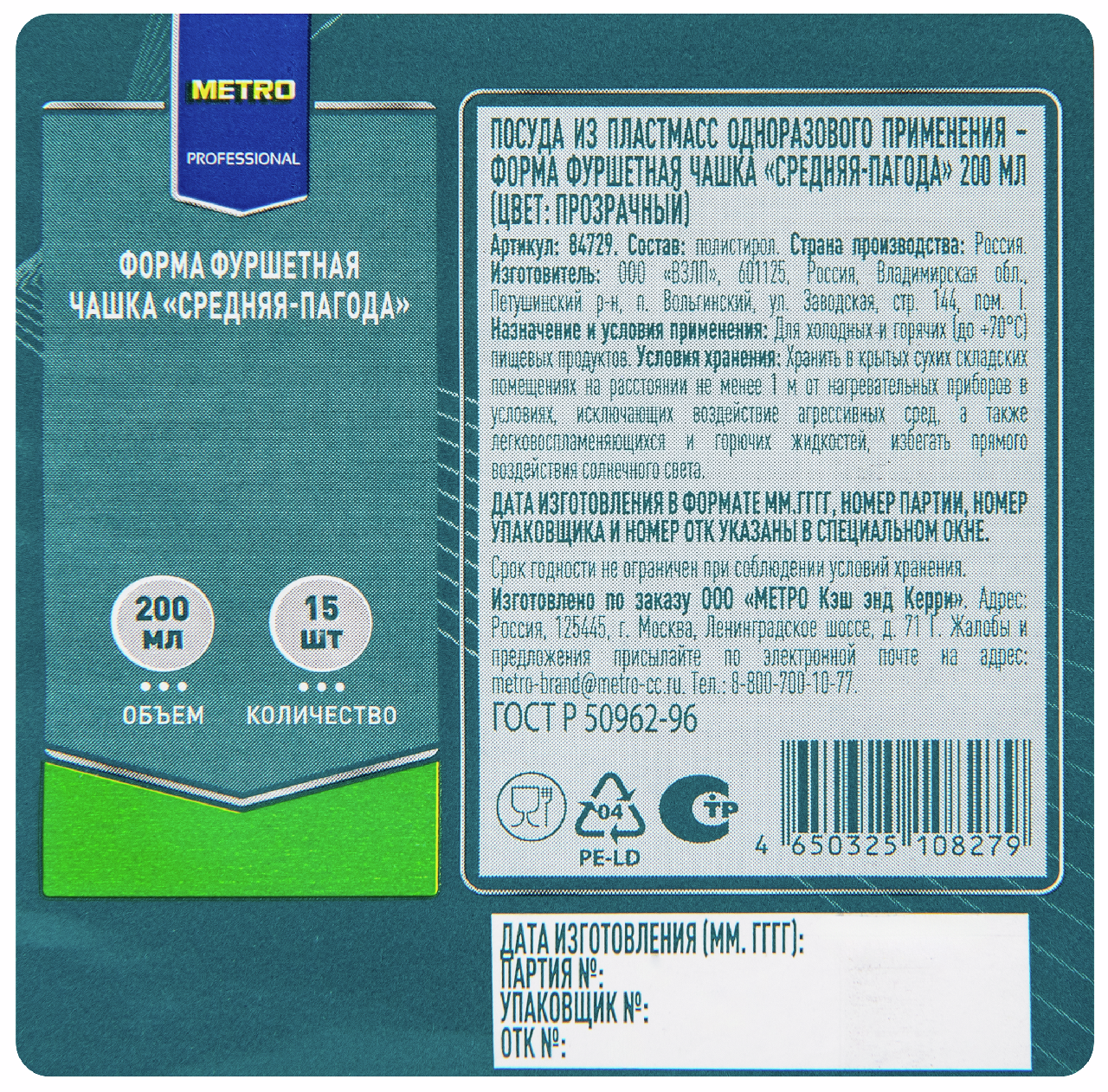 METRO PROFESSIONAL Форма для фуршета средняя пагода 15 шт., 200 мл предназначена для использования на праздниках, фуршетах, банкетах и презентациях. Изготовлена из высококачественного прозрачного пластика, который обеспечивает прочность и долговечность. Легкий вес и компактные размеры делают аксессуар удобным в использовании и транспортировке. С легкостью ухаживайте за формой — достаточно ��ромыть после использования, и посуда снова будет готова к творческим кулинарным экспериментам. С формами для фуршета каждое ваше мероприятие станет шедевром, приковывающим внимание гостей. Не упустите возможность подчеркнуть уникальность каждого блюда и сделать ваше мероприятие по-настоящему незабываемым. Преобразите стандартные закуски в кулинарное искусство, предоставляя гостям возможность наслаждаться великолепием визуального и вкусового восприятия. Форма для фуршета придает изысканный вид и выразительный стиль обычным закускам и десертам. Это идеальный способ подачи разных блюд: от мороженого и желе до пирожных, салатов и закусок. Вы можете создать красивый, изысканный стол, который поразит ваших гостей и подчеркнет вкус каждого блюд��. Идеально подходят для использования на разнообразных мероприятиях — будь то свадебное торжество, корпоративный банкет или стильный фуршет в домашних условиях.
