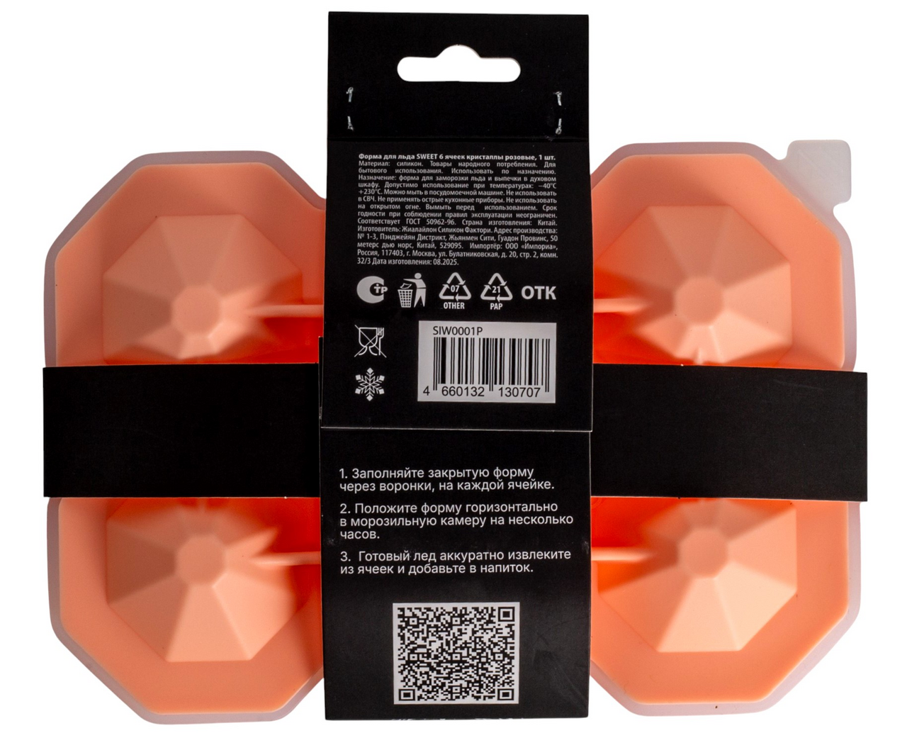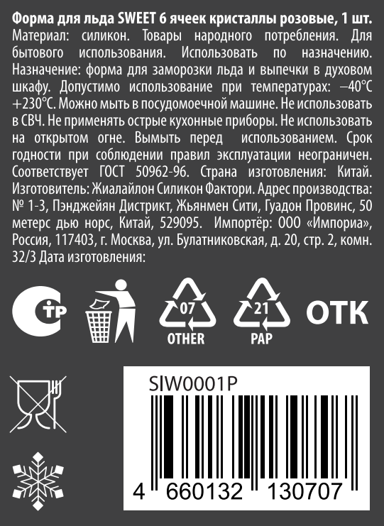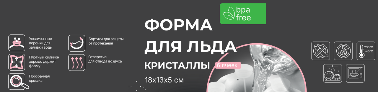 Форма для льда Sweet 6 ячеек кристаллы розовые изготовлена из силиконового материала, что позволяет легко и без усилий извлекать кубики льда из формочек для льда. Эти формы для льда подходят не только для охлаждения напитков, таких как виски, водка, вода, коктейли и соки, но и для заморозки сока, кофе, фруктов и чая.