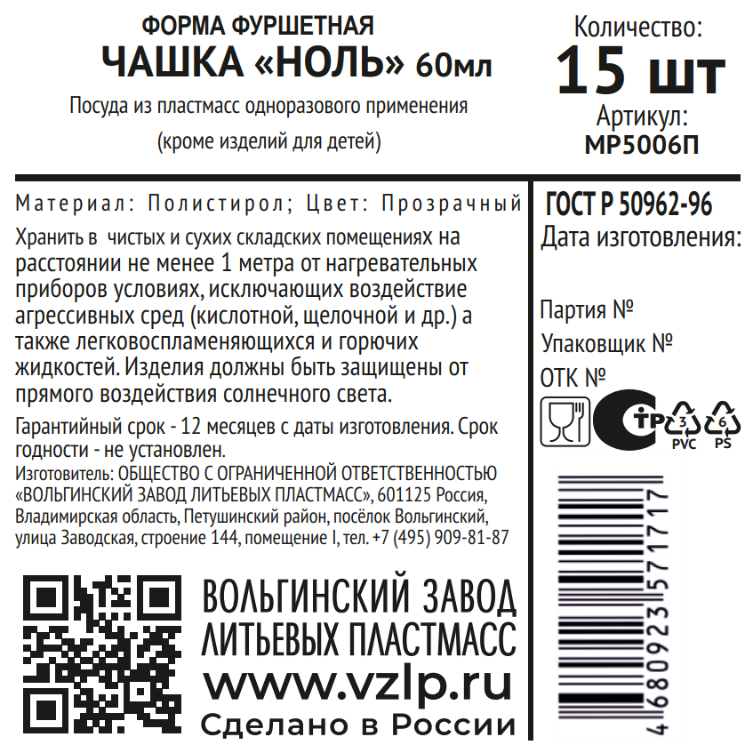 Форма для фуршета Vzlp Чашка прозрачная ноль 15шт, 60мл