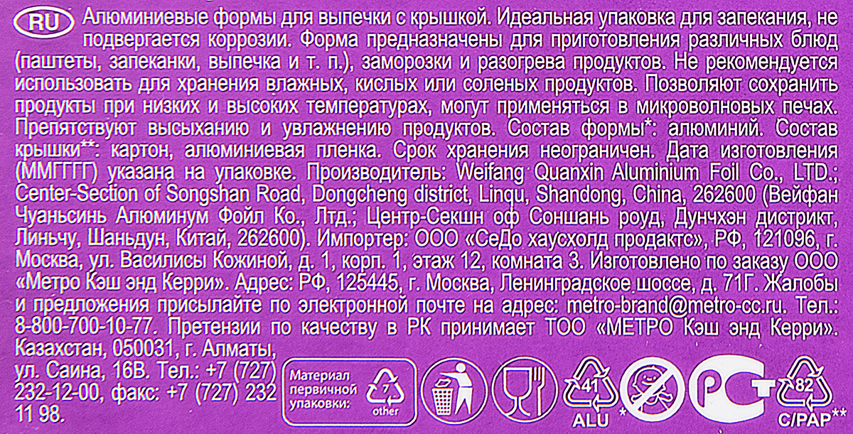 METRO PROFESSIONAL Формы алюминиевые с крышкой, 148х118х50 мм, 50 шт. — жаропрочная форма с удобными бортиками, которая хорошо подойдет для приготовления различных блюд. К материалу продукты не прилипают, и готовое кушанье легко извлекается. Изделие можно использовать в газовых и электрических духовых шкафах, морозильных камерах. Формы также подходят для хранения и заморозки продуктов, приготовления желе или холодца. Каждая формочка оснащается практичной крышкой. Накрывать крышку следует фольгированной стороной внутрь, что поможет продлить температурный режим продуктов, сохранит их свежесть. Крышка плотно прилегает к контейнеру, защищая его содержимое от проникновения влаги, пыли, посторонних частиц. Алюминий не вступает в реакции с продуктами и является безопасным материалом для здоровья человека.