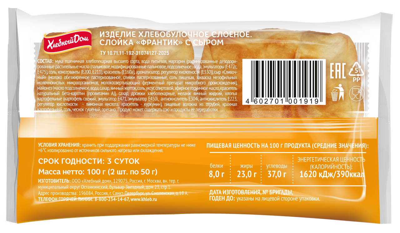 Конвертик из слоеного теста с сырной начинкой. Он обладает восхитительным вкусом и идеально дополнит чашечку горячего чая или станет самостоятельным сытным перекусом. В удобной упаковке два вкусных франтика.
