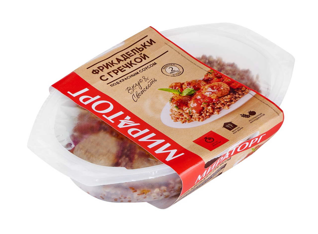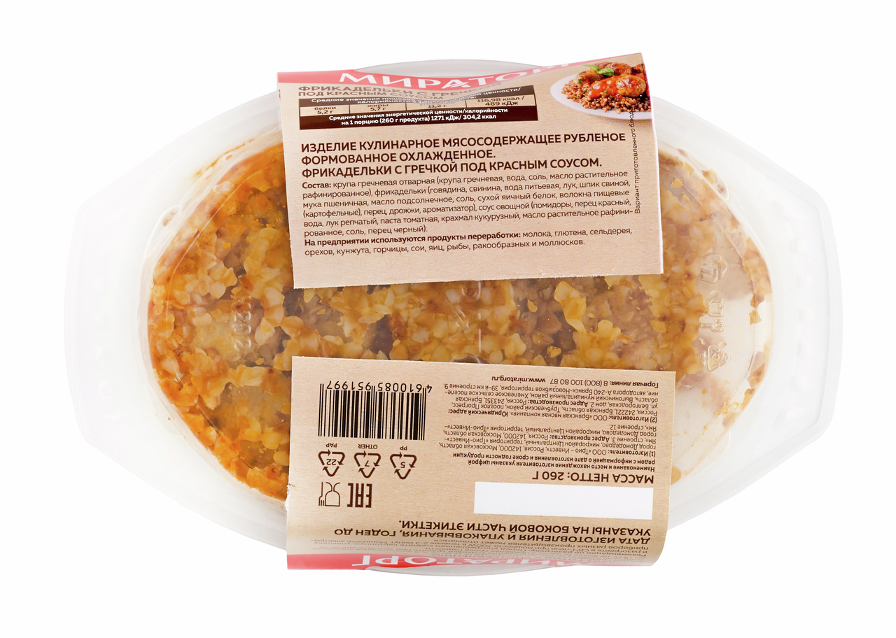 Крупа гречневая (крупа гречневая, вода, соль, масло растительное рафинированное), фрикадельки (говядина, свинина, вода питьевая, лук, шпик свиной, мука пшеничная, масло подсолнечное, соль, сухой яичный белок, волокна пищевые (картофельные), перец, дрожжи, ароматизатор), соус овощной (помидоры, перец красный, вода, лук репчатый, паста томатная, крахмал кукурузный, масло растительное рафинированное, соль, перец черный).