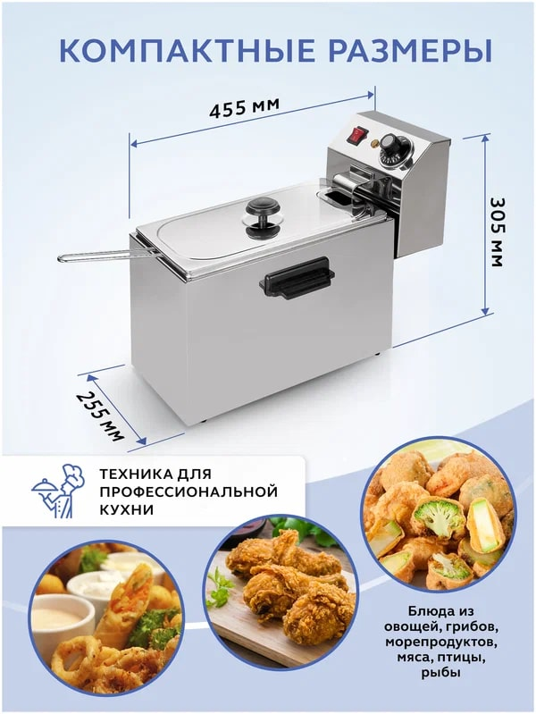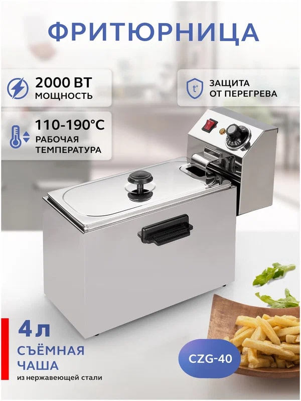 Электрическая фритюрница Gastrorag CZG-40 мощностью 2000 Вт - это техника для профессиональной кухни, предназначенная для быстрой жарки в глубоком слое масла блюд из овощей, мяса и птицы, морепродуктов и рыбы. Продукты, погруженные в горячий фритюр, моментально покрываются хрустящей корочкой, которая защищает их от пересыхания и поглощения излишнего жира. Для усиления эффекта используются разнообразные панировки и кляры. Настольная электрофритюрница оснащена съемной чашей большого объема (4 л) из нержавеющей стали с крышкой и полноразмерной корзиной, в которую можно загрузить до 800 г продукта. Фритюрный шкаф имеет простое электромеханическое управление, температура масла плавно регулируется в диапазоне 110-190С при помощи ручки термостата. Защитный термостат отк��ючает электропитание в случае перегрева. Если это произошло, то нужно дать устройству остыть и взвести защитный термостат при помощи кнопки, расположенной в нижней части блока управления. Корпус фритюрницы изготовлен из нержавеющей стали.