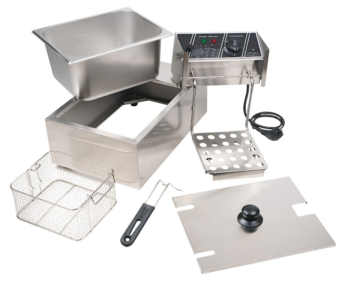 Установка: настольная Подключение: 220В.Количество ванн: 1. Объем одной ванны: 6л.Температурный режим: от 60 до 190С.Мощность: 2.5кВт. Предназначена для приготовления в масле (фритюре) различных продуктов питания: мяса, рыбы, овощей и мучных изделий на предприятиях общественного питания и торговли.Фритюрница является идеальным инструментом для получения вкусных и хрустящих жареных блюд, которые присутствуют в меню любого ресторана, кафе и так далее.Рекомендуется к применению в небольших кафе, фаст-фуд заведениях и на других предприятиях общественного питания малого формата.