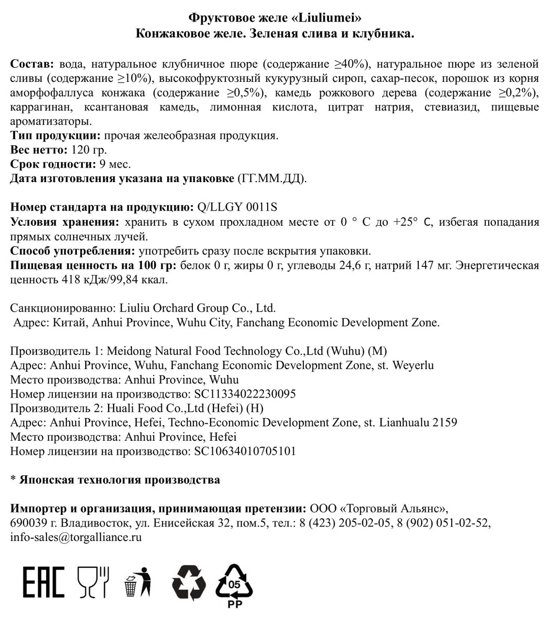 Фруктовое желе Liuliumei конжаковое со сливой и клубникой, 120г