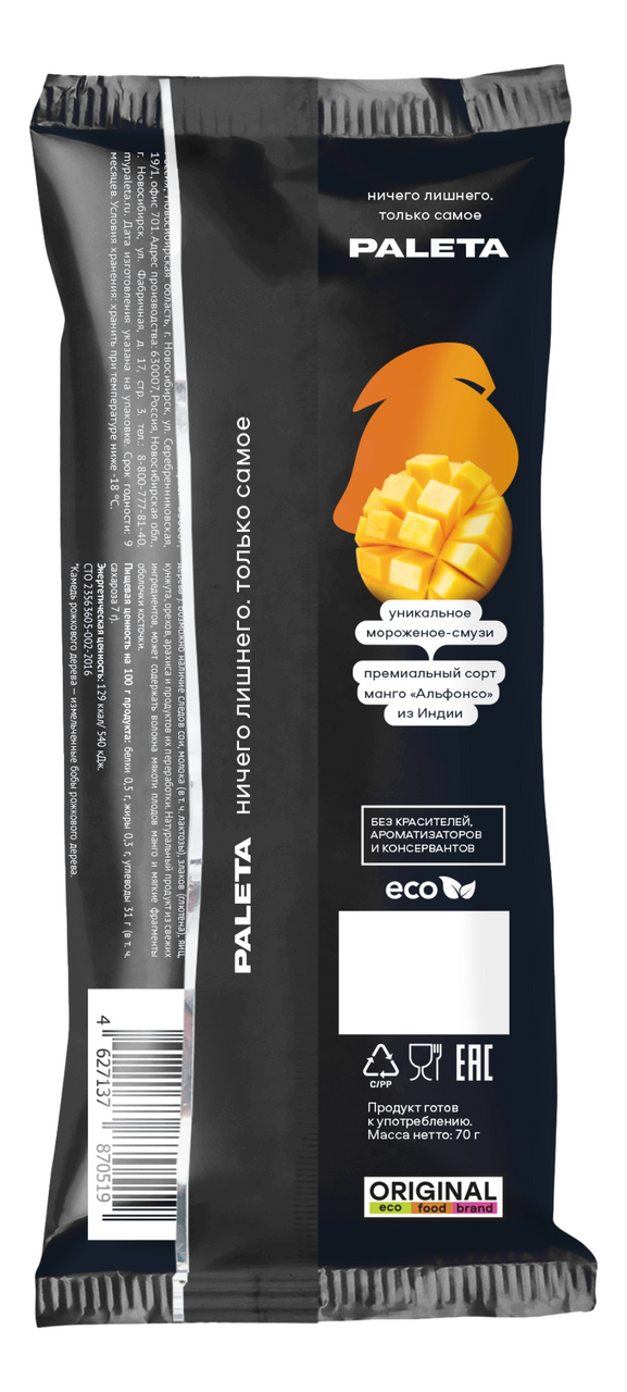 Замороженный десерт из натурального мангового пюре порадуется всех любителей тропических вкусов. Холодное лакомство приятно охладит в жаркую погоду и подарит настоящее гастрономическое удовольствие всем сладкоежкам. Мороженое-смузи отличается приятной тающей консистенцией, в меру сладким вкусом с приятной ярко выраженной кислинкой. Продукт произведён из натуральных ингредиентов, не содержит синтетических красителей и усилителей вкуса.