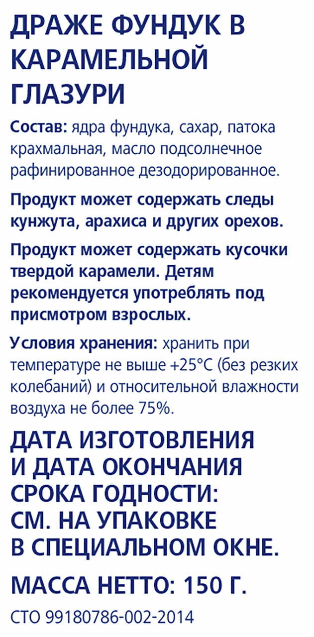 Ядра орехов фундука обжаренные, сахар, смесь для карамелизации попкорна Caramel (глюкоза, сахар, соль поваренная пищевая, эмульгатор лецитин соевый), масло кокосовое. Возможно присутствие в незначительном количестве частиц других орехов и арахиса.