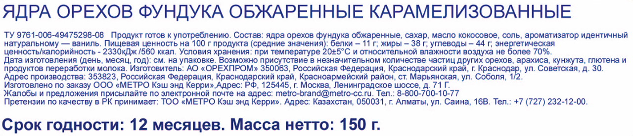 Фундук METRO Chef в карамели, 150 г – сытная и питательная закуска, состоящая из обжаренных орехов, помещенных в сладкую карамельную глазурь. Она отличается пикантным вкусом, хорошо утоляет голод и помогает восстанавливать утраченные силы. Такой продукт станет удачным вариантом для перекуса в течение дня и может использоваться в качестве легкой закуски в сочетании с прохладительными напитками. Фундук, или, как его еще называют, лесной орех, не только обладает приятным вкусом, но и приносит пользу организму. Он является незаменимым источником аминокислот, растительного белка и фолиевой кислоты, содержит большое количество меди, магния, марганца, железа, калия, кальция, витаминов из группы В, РР, Е, А, К и С. Употребление фундука положительно сказывается на состоянии кожи и сосудов, укрепляет сердечную мышцу, снижает риск развития анемии, нормализуют обмен веществ и работу органов пищеварения, благотворно влияет на нервную систему, укрепляет иммунитет. Орех в карамельной глазури помещен в практичную мягкую упаковку флоу-пак, которой без труда найдется место даже в небольшой сумочке или кармане одежды. Благодаря порционной фасовке весом по 150 грамм этот продукт удобно брать с собой, отправляясь в поездку, офис или учебное заведение, чтобы перекусить в течение дня.