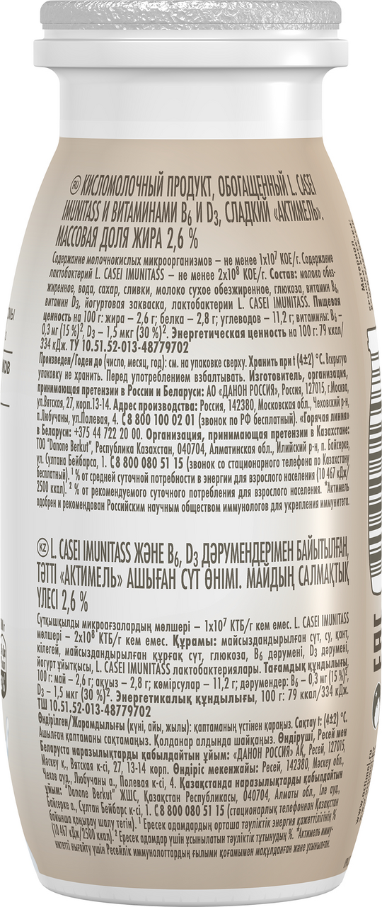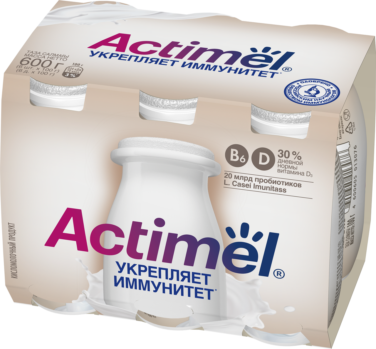Классический вкус Актимель, для тех, кто предпочитает кисломолочные продукты без добавок. Напиток обогащен витаминами D3 и B6 и полезными лактобактериями L’Casei Imunitass. Для укрепления иммунитета рекомендуется выпивать 2 бутылочки Actimel в день. Так вы обогатите свой организм полезными бактериями и витаминами, которые необходимы для нормальной работы иммунной системы. Рекомендован Российским научным обществом иммунологов для укрепления иммунитета в рамках сбалансированного питания и здорового образа жизни.