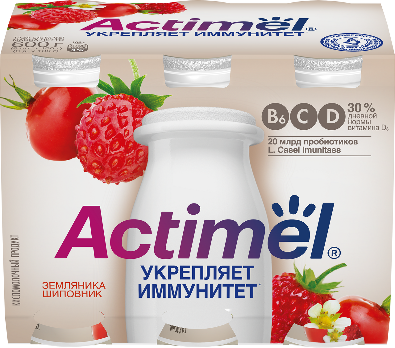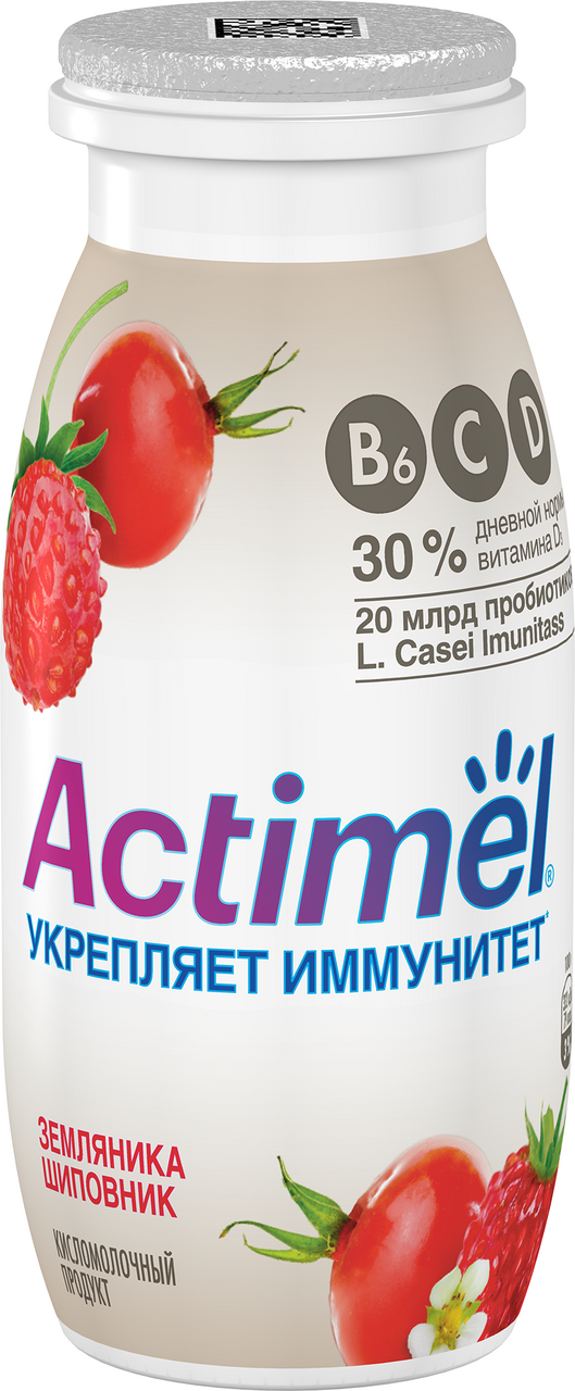 Отличное сочетание двух ягодных вкусов напомнит о лесной свежести и летних днях. Нежный вкус земляники смешивается с кисловатым вкусом шиповника, добавляя в Actimel яркие ягодные нотки. Напиток Актимель Земляника-шиповник не только вкусный, но и полезный напиток, который поможет укрепить иммунитет благодаря содержанию в нем лактобактерий L. CASEI IMUNITASS и витаминов С, В6 и D3.Рекомендуется выпивать 2 бутылочки Actimel в день. Так вы обогатите свой организм полезными бактериями и витаминами, которые необходимы для нормальной работы иммунной системы. Рекомендован Российским научным обществом иммунологов для укрепления иммунитета в рамках сбалансированного питания и здорового образа жизни.