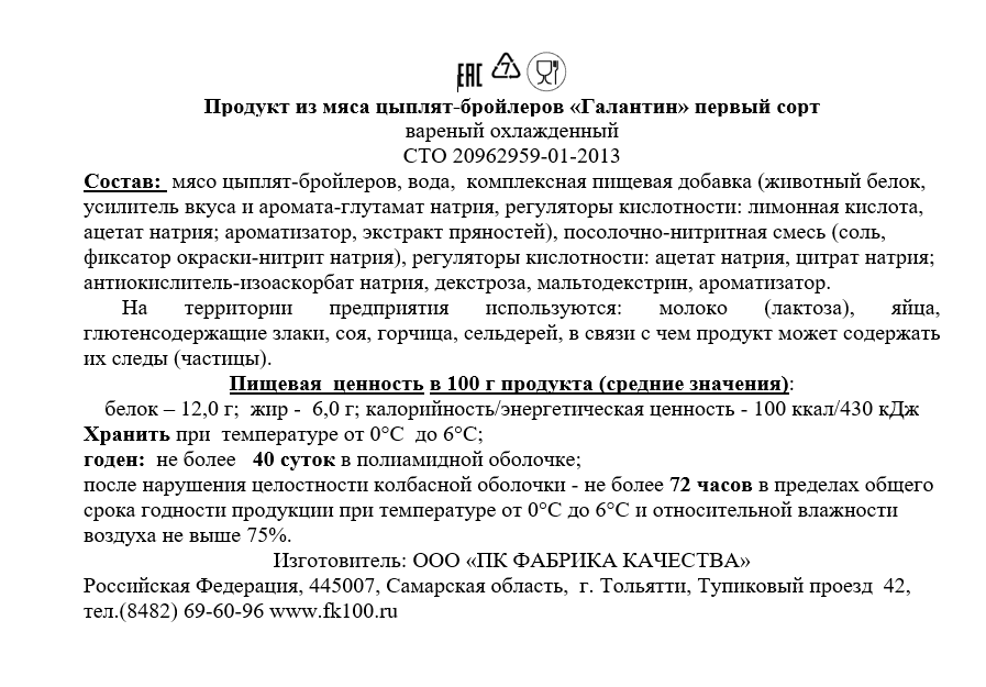 Это заливное из нежного мяса цыплят-бройлеров – куриный рулет, завёрнутый в слой ароматного желе. Продукт отлично сохраняет форму при нарезании на ломтики любой толщины и станет украшением стола. Он хорош и в качестве самостоятельной закуски, и в сочетании с дижонской горчицей, хреном, свежей зеленью, оливками и каперсами. Подойдёт галантин и для приготовления бутербродов.