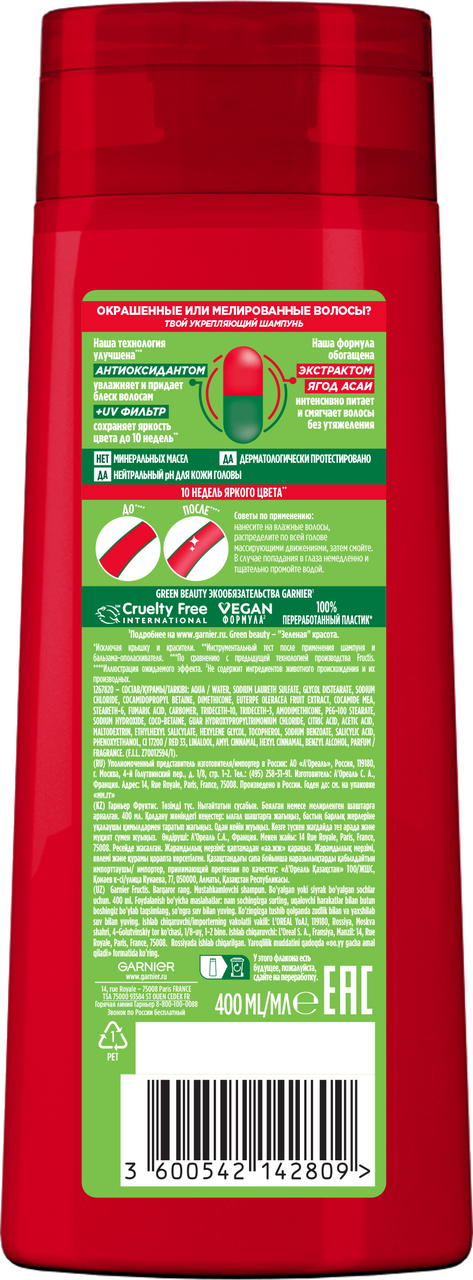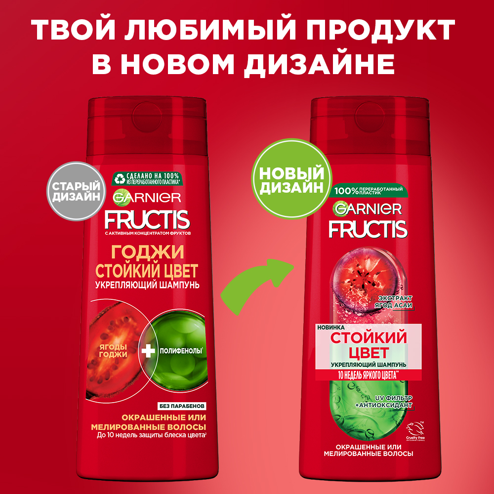 Fructis представляет обновляющую систему, которая совмещает в себе суперфрукт натурального происхождения с активными ингредиентами. Ваши волосы выглядят более блестящими и сильными. Шампунь Годжи Стойкий цвет обогащен суперингредиентами: Формула с ягодами годжи и полифенолами питает и придает блеск волосам. Доказано! До 10 недель защита блеска окрашенных волос.