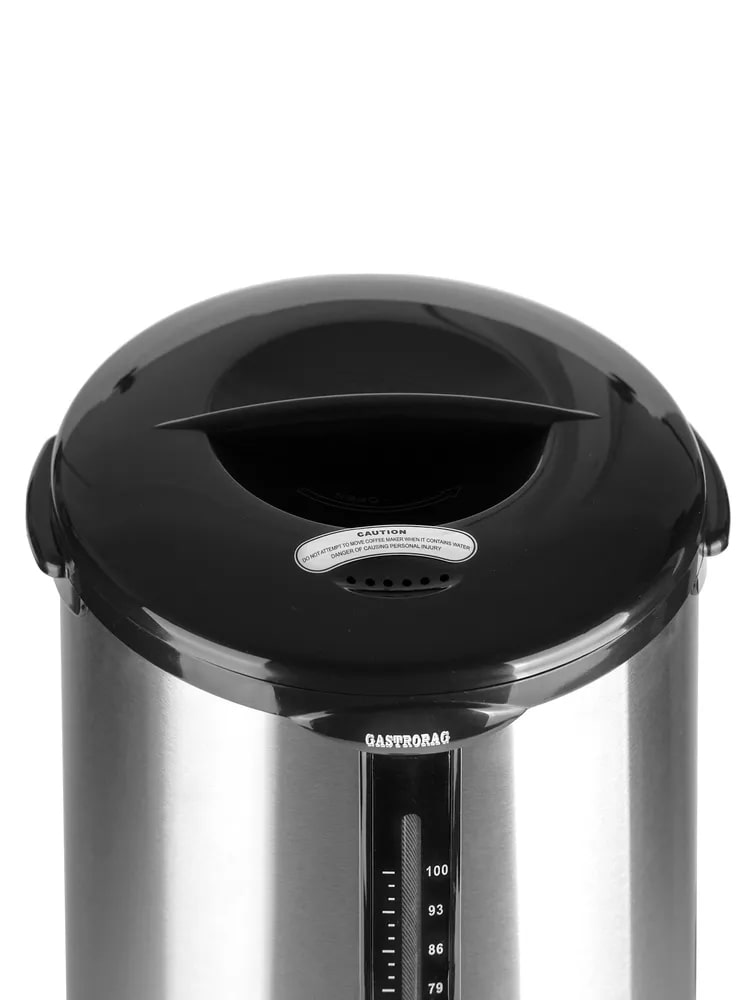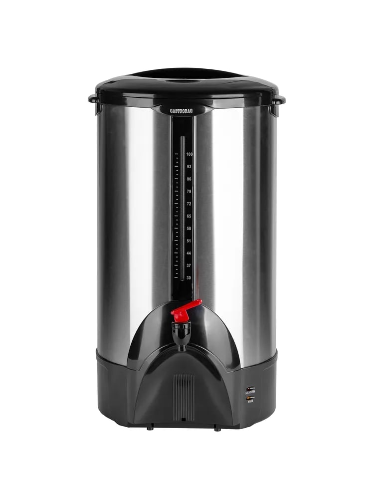 Наливной кипятильник - кофеварочная машина Gastrorag DK-100 предназначен для нагрева, кипячения и розлива горячей воды, а также для приготовления кофе на фильтре на предприятиях общественного питания и торговли. Модель оснащена перколяционной трубкой и фильтр для молотого кофе с крышкой. Объём резервуара рассчитан на приготовление 100 чашек кофе. Температурный диапазон – до 95C. Время кипячения полного резервуара 50 – 55 минут. Корпус изготовлен из нержавеющей стали и пластика чёрного цвета.