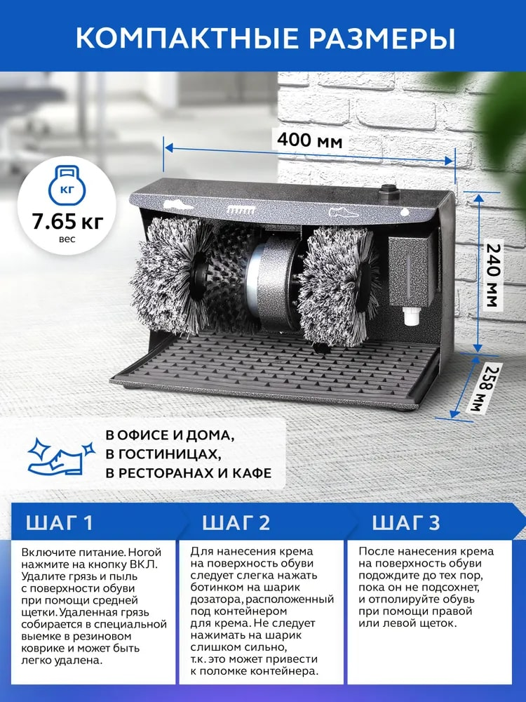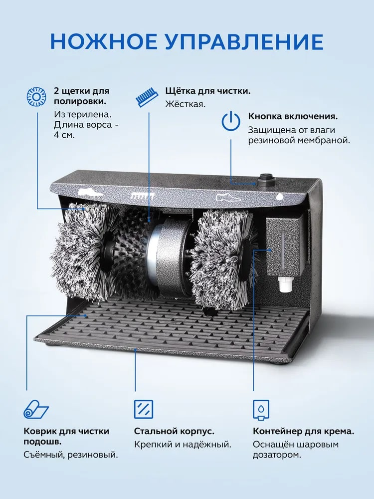 Электрическая машина для чистки обуви Gastrorag JCX-9 – это компактная и недорогая техника для дома и офиса, гостиницы, ресторана и кафе. Благодаря ей ваша обувь, а также обувь ваших сотрудников, клиентов и гостей будет выглядеть как новая без особых затрат времени и средств. Машинка может быть установлена везде, где есть розетка 220 В. Прочный стальной корпус покрыт порошковой эмалью, устойчивой к внешним воздействиям. Обувечистка имеет простое и удобное управление нажатием ноги на кнопку, защищенную от влаги резиновой мембраной. В комплект входят: две щетки для полировки из мягкого и прочного синтетического волокна терилена, который не повреждает верхний слой кожи даже при частом применении и имеет ресурс до 10 лет; контейнер для крема с шаровым дозатором; тканевый коврик для чистки подошв. Держатель контейнера для крема имеет прорезь, которая позволяет следить за уровнем крема. Вы можете наполнять контейнер любым жидким кремом для обуви, однако мы рекомендуем использовать универсальный бесцветный крем Gastrorag SPW-01 в стандартных пластиковых контейнерах, которые вставляются непосредственно в держатель машинки для чистки и полировки обуви. Это удобно, гигиенично и значительно экономит ваше время.