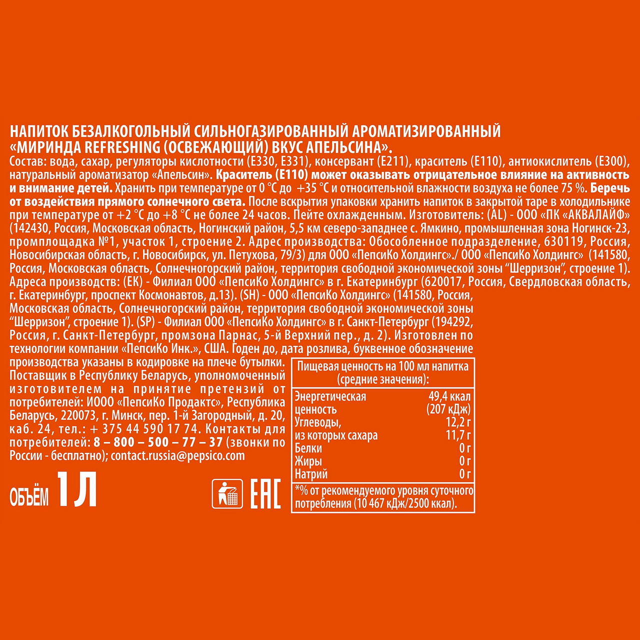Миринда - яркий, освежающий напиток с насыщенным вкусом и ароматом апельсина. О бренде: Mirinda появилась в горячей Испании в 1959 году, и в переводе с эсперанто название означает "достойный удивления". Яркий вкус напитка позволяет убедиться, что Mirinda действительно способна удивлять!●Освежающий вкус и сладкий аромат апельсина, яркий оранжевый цвет и пузырьки – насыщенный микс ощущений Mirinda!●Насыщенный вкус и аромат апельсина●Заряд фана и цитрусовой свежести на целый день!●С натуральным апельсиновым соком!Миринда - яркий, освежающий напиток с насыщенным вкусом и ароматом фруктов и ягод. О бренде: Mirinda появилась в горячей Испании в 1959 году, и в переводе с эсперанто название означает "достойный удивления". Яркий вкус напитка позволяет убедиться, что Mirinda действительно способна удивлять!В ассортименте Mirinda классический вкус апельсина с натуральным апельсиновым соком и линейка Mix-It с неожиданными и яркими вкусовыми сочетаниями: клубника-личи и ананас-груша.