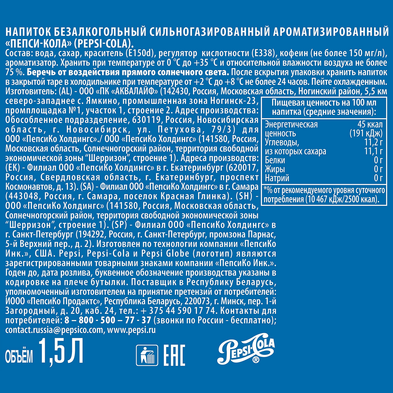 Пепси-Кола 1.5л - известный на весь мир безалкогольный прохладительный напиток, созданный в США в 1898 году. 69% потребителей выбирают Пепси-Колу среди всех кол.●Классический вкус Пепси●Освежающий●Заряжает отличным настроением на весь день.Пепси Кола - легендарный напиток, изобретенный фармацевтом К. Бредхемом в 1893 году. Pepsi завоевал популярность по всему миру.