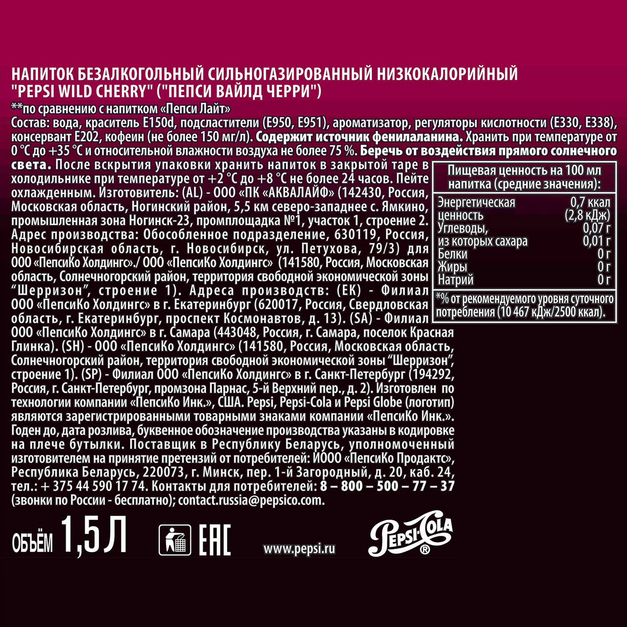 Напиток Пепси Вайлд Черри 1.5л - диетическая версия известного на весь мир безалкогольного прохладительного напитка с насыщенным вкусом вишни без сахара и калорий (всего 0.7ккал на 100г).●Безупречный вкус дикой вишни●Чувства переполняют, эмоции льются через край c дерзкой яркой Pepsi Cherry! Заряжает фруктовым настроением! ●Удобно взять с собой и насладиться ярким напитком в любом месте. ●Без калорийПепси Кола - легендарный напиток, изобретенный фармацевтом К. Бредхемом в 1893 году. Pepsi завоевал популярность по всему миру.