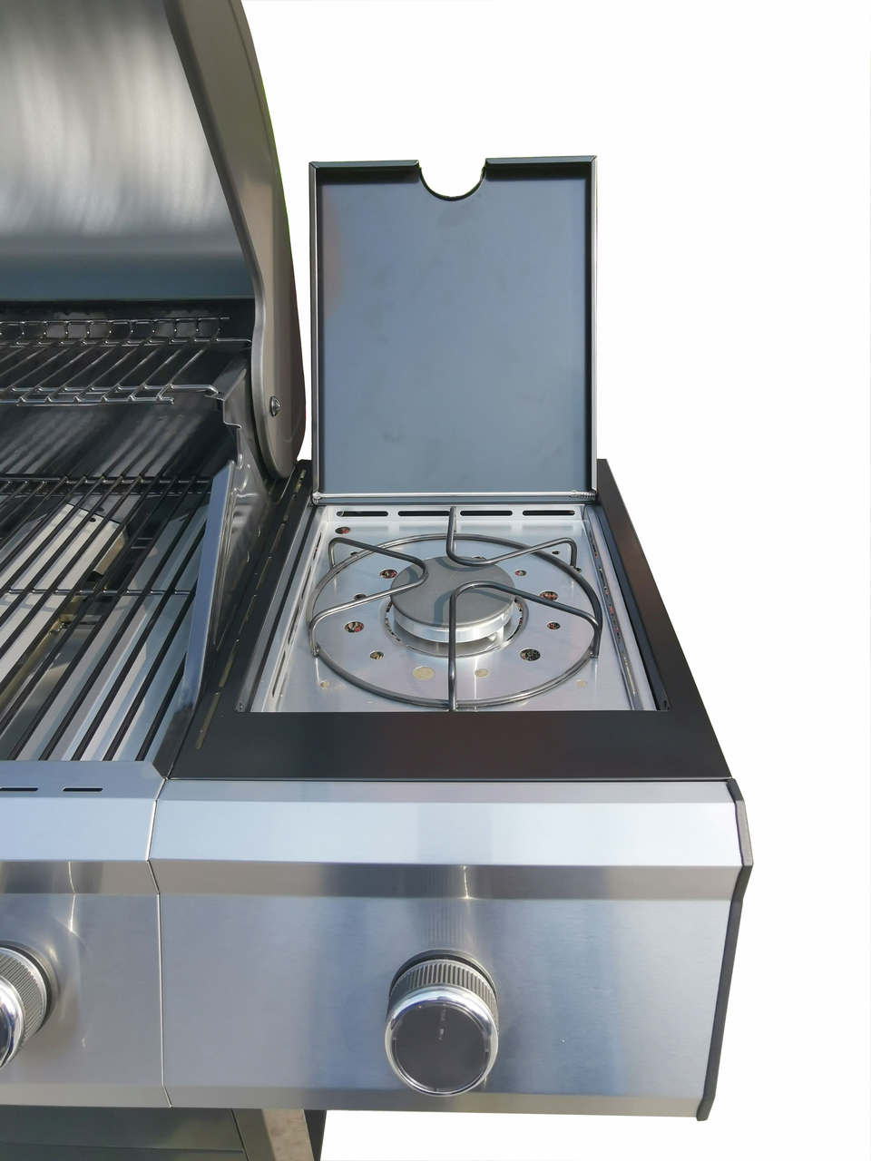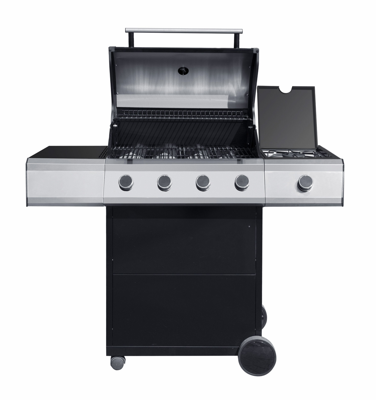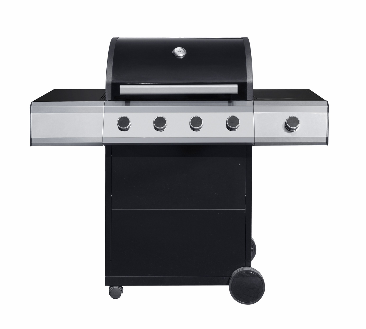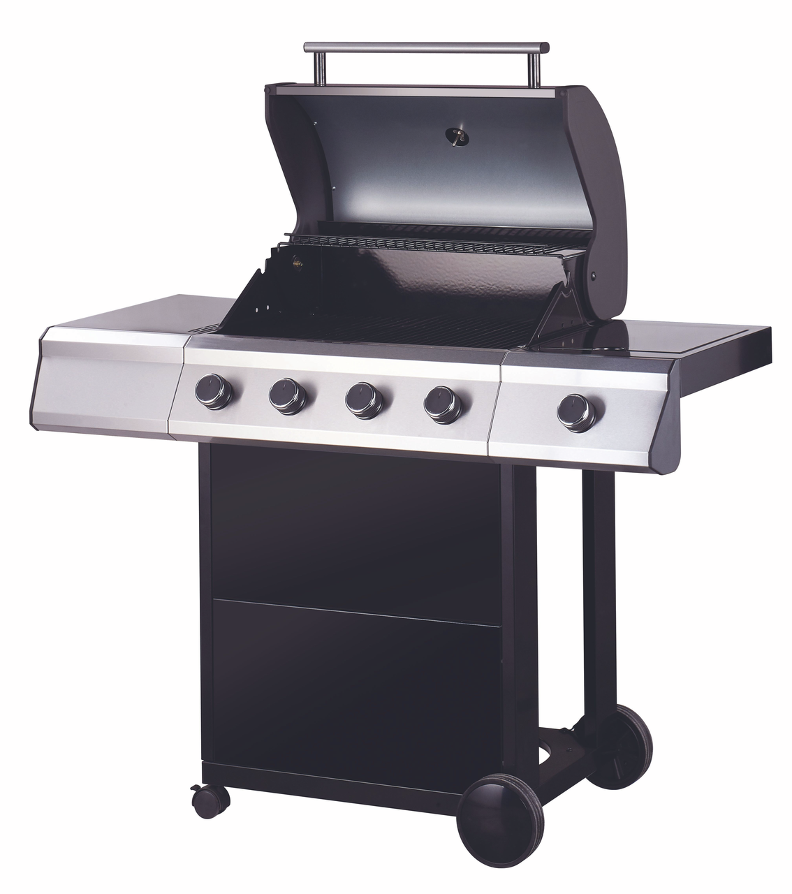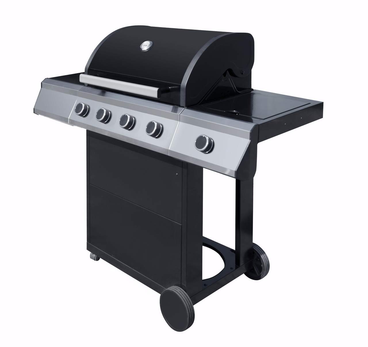 Гриль стационарный газовый 4+1 горелка, 124 х 60 х 112 см хорошо подходит для приготовления мясных и рыбных изделий на природе. Модель отличается стильным дизайном, поэтому органично впишется в любой интерьер зоны отдыха. Гриль имеет широкую рабочую поверхность в виде металлической решетки для приготовления различных блюд. Под ней находится источник тепла. Отличительная особенность модели заключается в возможности подключения к газовому баллону, что является хорошим вариантом для использования на природе. Устройство помогает собрать целую компанию родных и близких возле барбекю на садовых участках. Гриль прост в эксплуатации. Разогревается он в течение 5 минут, что дает возможность готовить пищу почти сразу. Модель оснащается большой крышкой, которая эффективно держит тепло и сохраняет всю сочность продуктов. Колеса небольших размеров обеспечивают удобное перемещение гриля по всей территории участка.