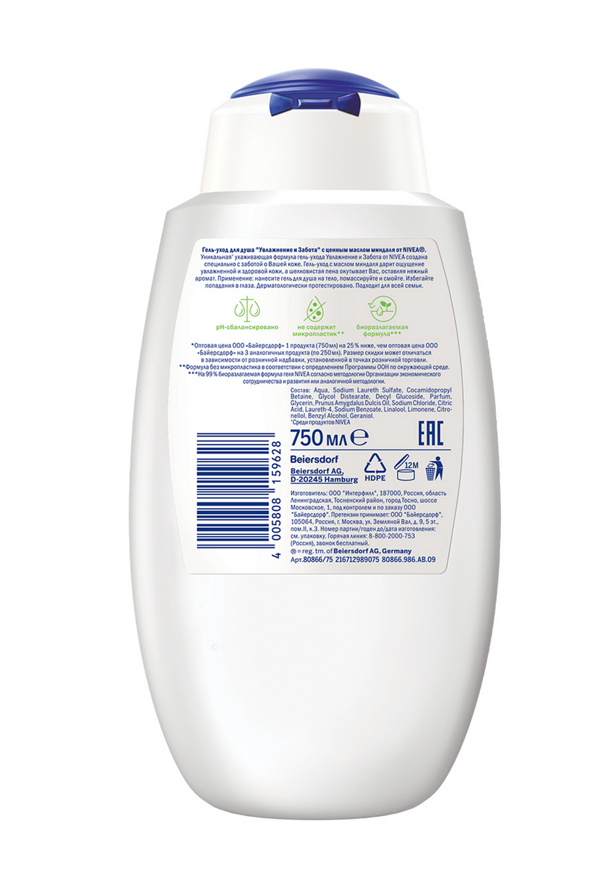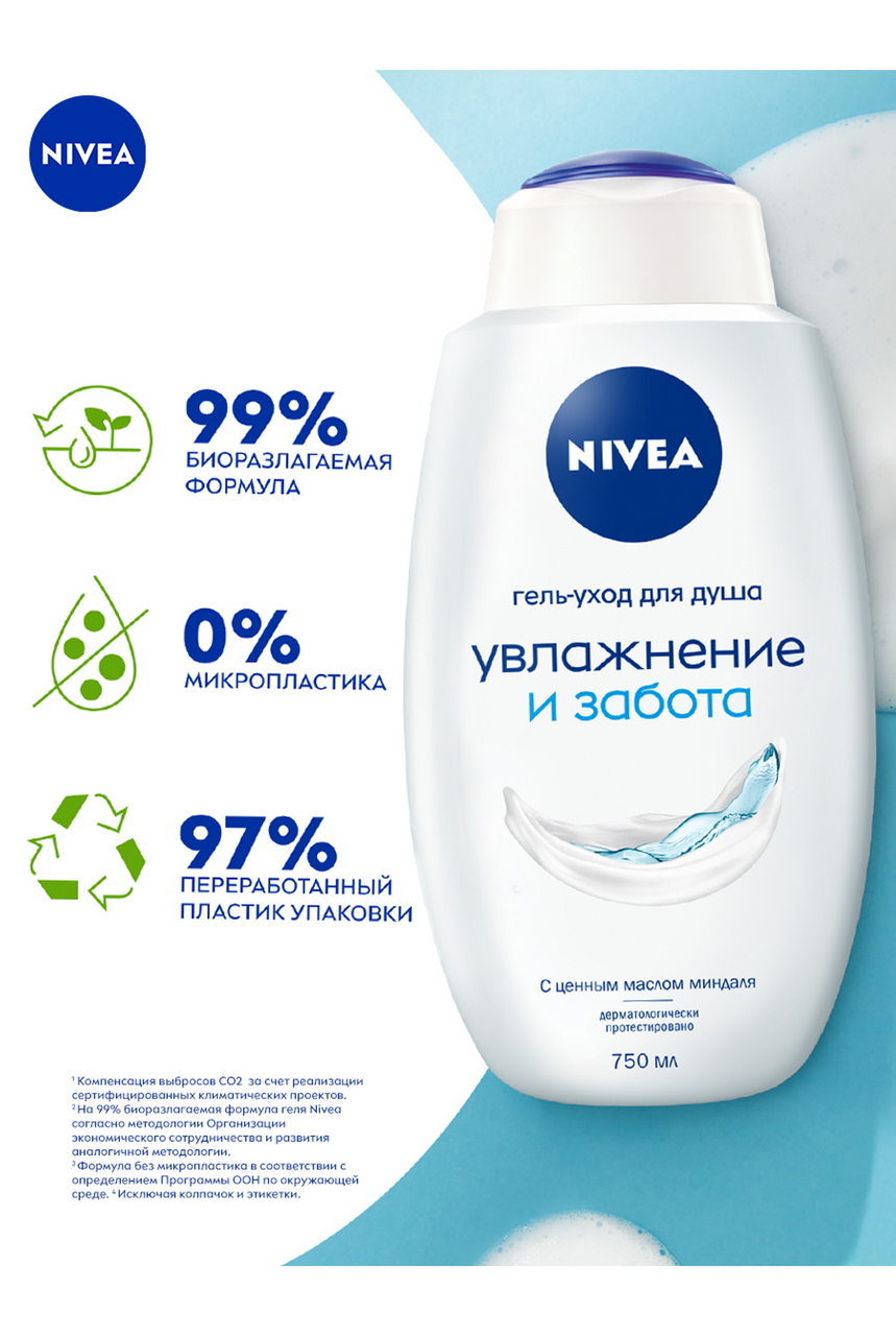 Приятно, когда под рукой есть средство, которое очищает кожу и одновременно питает ее. Гель-уход для душа Nivea Увлажнение и забота бережно ухаживает за твоим телом каждый день. Кожа становится нежной и эластичной - вот результат ежедневного использования геля Увлажнение и забота от Nivea. Обогащённый маслом миндаля, гель мягко очищает Вашу кожу и ухаживает за ней, делая её гладкой и шелковистой. Сбалансированный pH предотвращает пересушивание кожи, поддерживая ее естественный уровень увлажненности. А мягкий нейтральный аромат подойдет для всей семьи. Обновленная биоразлагаемая формула не содержит микропластик, потому что мы заботимся не только о красоте и здоровье кожи, но и об окружающей среде! Мы хотим менять мир к лучшему и ставим перед собой амбициозные цели в сфере защиты окружающей среды. Исследователи Nivea постоянно совершенствуют формулы, чтобы сделать наши средства максимально подходящими для кожи, одновременно минимизируя уровень их воздействия на природу.