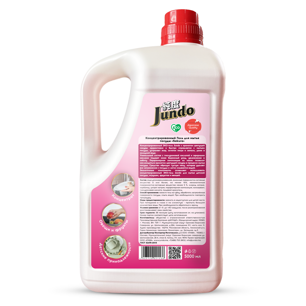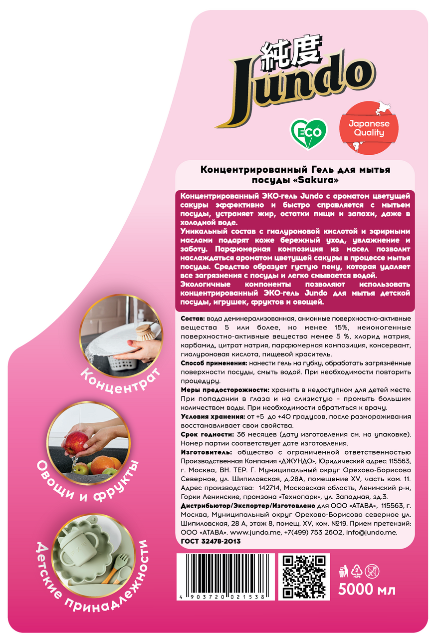 Концентрированный Гель Jundo c ароматом цветущей сакуры эффективно и быстро справляется с мытьем посуды, устраняет жир, остатки пищи и запахи, даже в холодной воде.Уникальный состав с гиалуроновой кислотой и эфирными маслами подарят коже бережный уход, увлажнение и заботу. Парфюмерная композиция из масел позволит наслаждаться ароматом цветущей сакуры в процессе мытья посуды. Средство образует густую пену, которая удаляет все загрязнения с посуды и легко смывается водой.Экологичные компоненты позволяют использовать концентрированный Гель Jundo для мытья детской посуды, игрушек, фруктов и овощей. Концентрированного состава с формулой 1=3 хватит надолго. Удобная и красивая перламутровая канистра оснащена удобным горлышком, с помощью которого Вы легко сможете перелить гель в любой флакон.