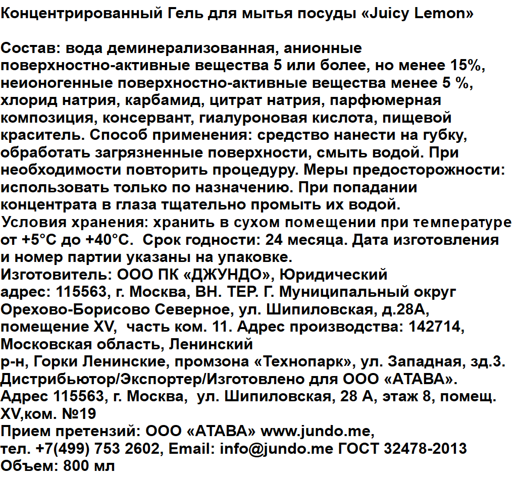 Гель для мытья посуды Jundo Juicy lemon, 800мл