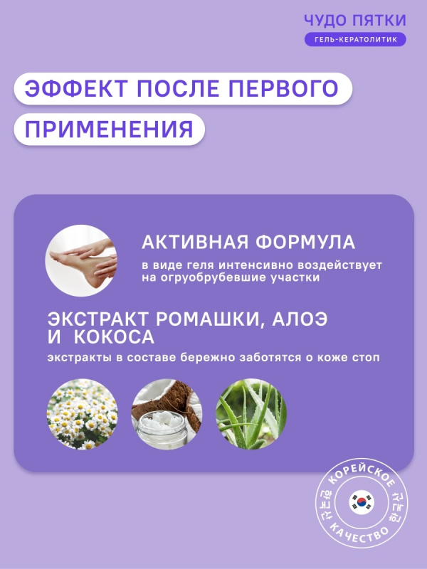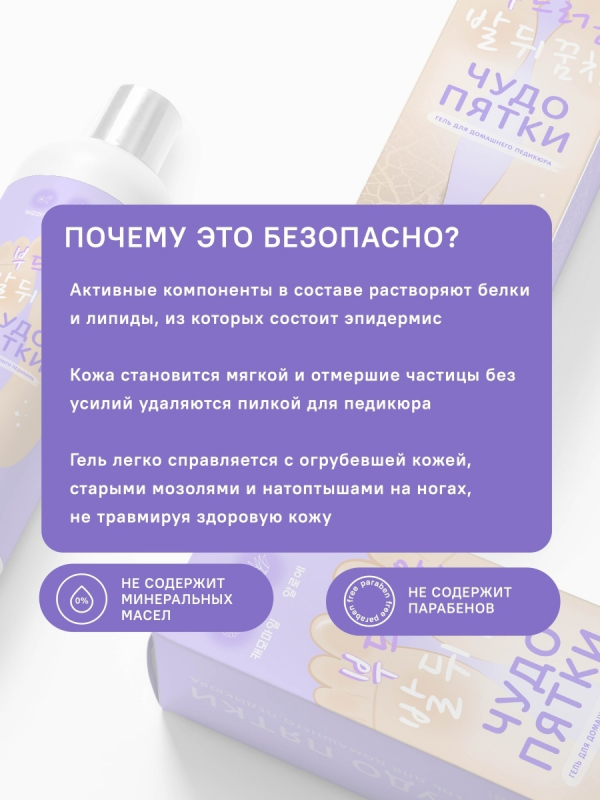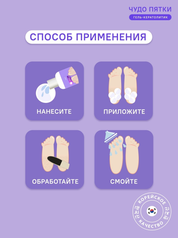 Чудо пятки - универсальное средство для педикюра, которое поможет избавиться от мозолей и натоптышей. Результат виден уже после первого применения, всего за 3-5 минут кожа становится мягкой, гладкой и увлажненной. После применения геля рекомендуется нанести увлажняющий крем для закрепления результата.
