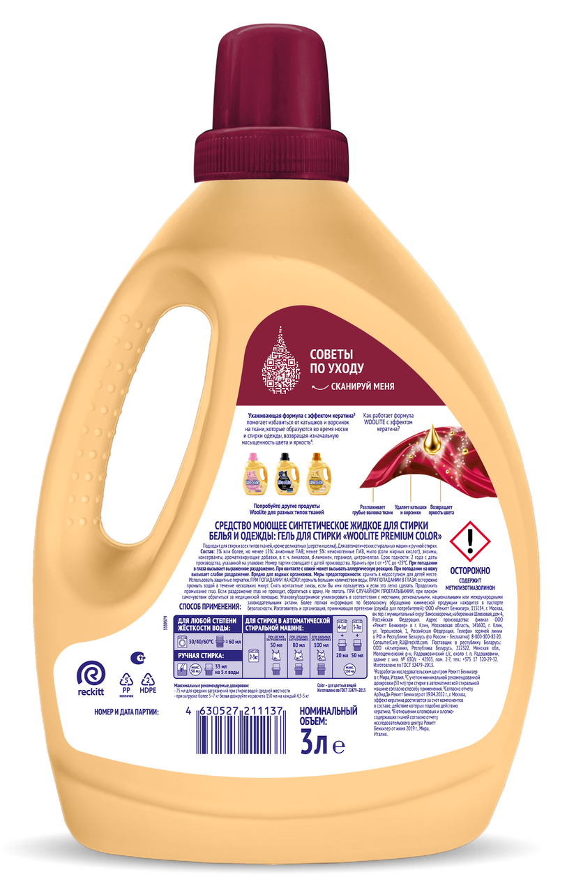 Средство моющее синтетическое жидкое для стирки белья и одежды: гель для стирки Woolite premium color. Подходит для стирки всех типов тканей, кроме деликатных (шерсти и шелка). Для автоматических стиральных машин и ручной стирки.