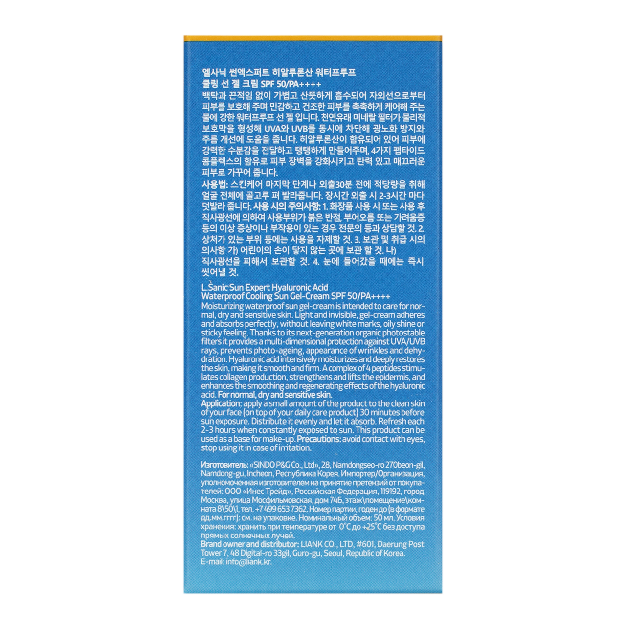 Гель-крем для лица L.Sanic солнцезащитный водостойкий с гиалуроновой кислотой SPF50, 50мл
