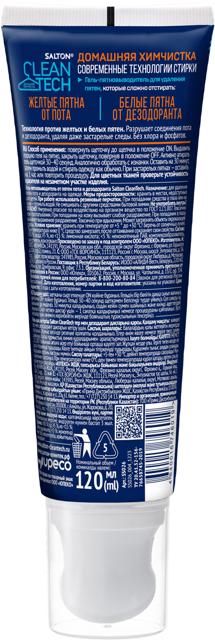Гель-пятновыводитель Salton Cleantech от пятен пота и дезодоранта, 120мл