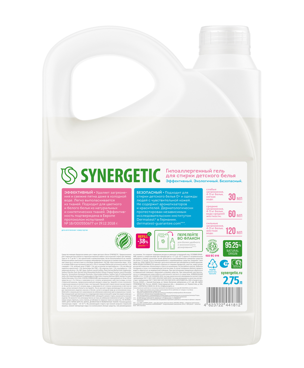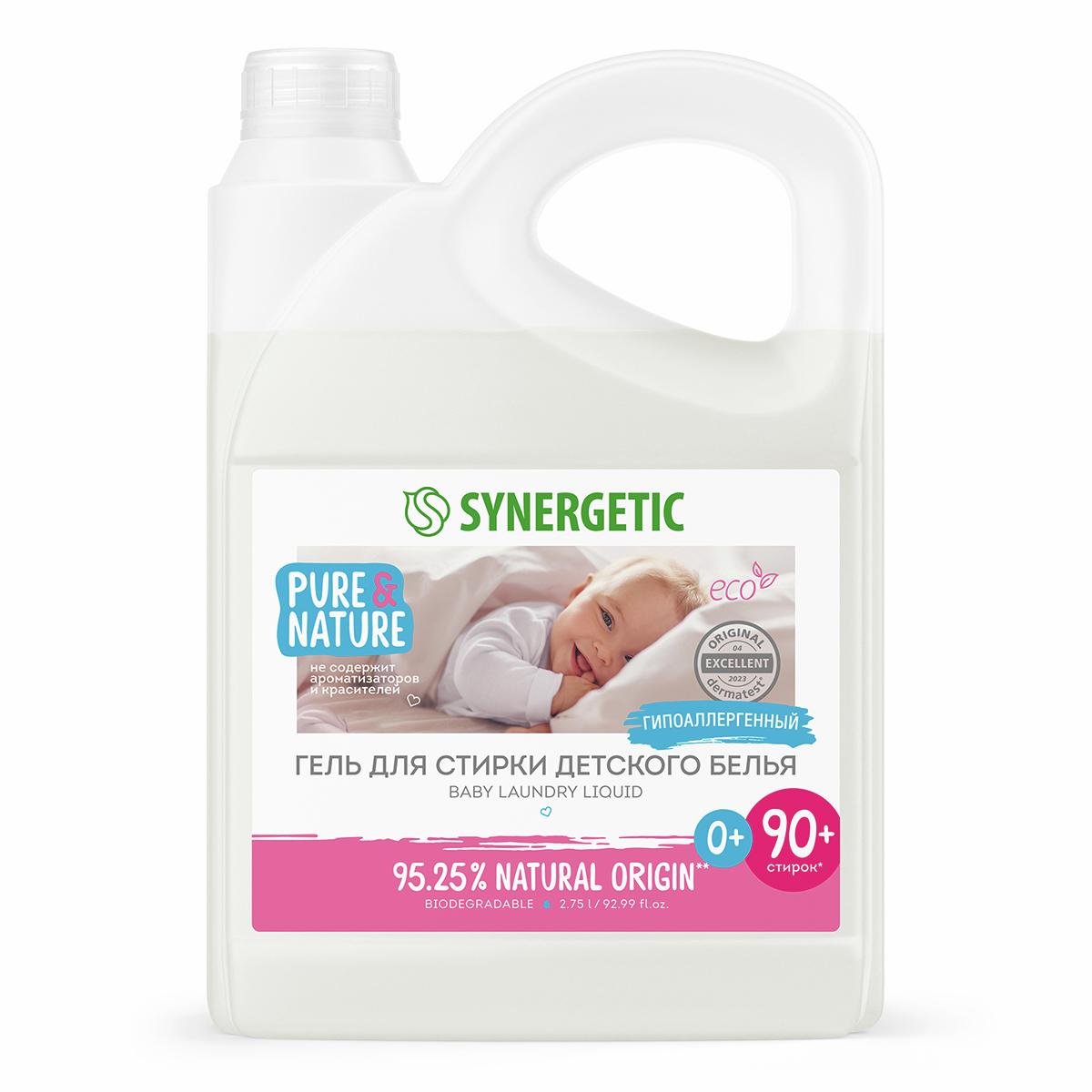 Биоразлагаемый концентрированный гель для стирки Synergetic для детского белья обеспечивает бережное и эффективное очищение тканей и устраняет неприятные запахи. Уникальный комплекс растительных тензидов и зеленых хелатов эффективно удаляет загрязнения и свежие пятна с волокон ткани даже в холодной воде. Функциональные добавки предотвращают окрашивание, а также повторное оседание загрязнений на ткани, сохраняя ее первоначальный вид, насыщенность цвета, прочность и структуру. Гель предназначен для стирки цветного и белого белья из натуральных и синтетических тканей, для детского белья 0+ и одежды людей с чувствительной кожей. Средство можно использовать в стиральных машинах любого типа и при ручной стирке при температуре 20 - 90C. Биоразлагаемый гель полностью выполаскивается из тканей.
