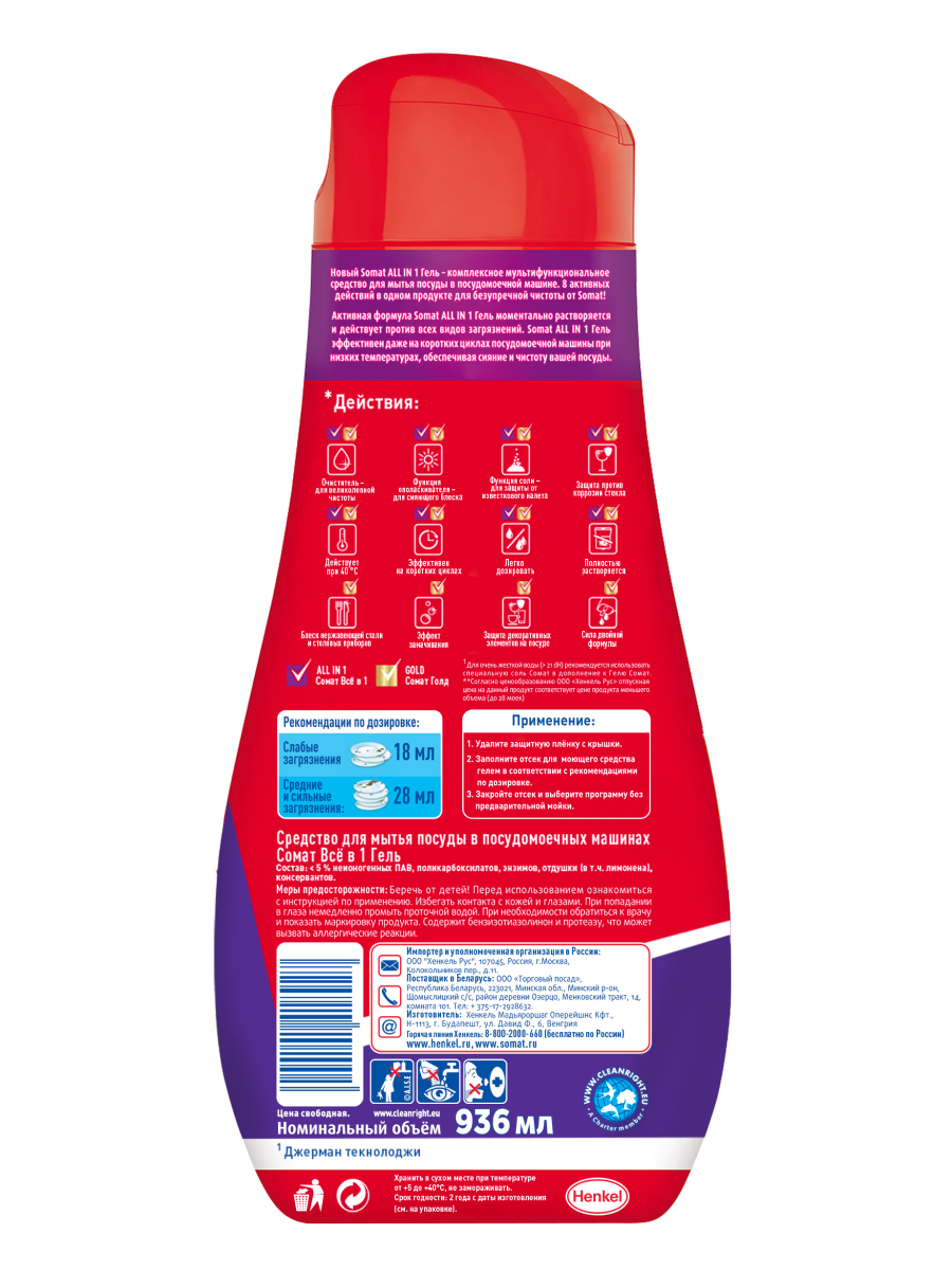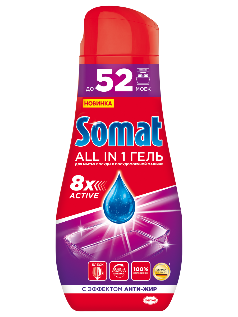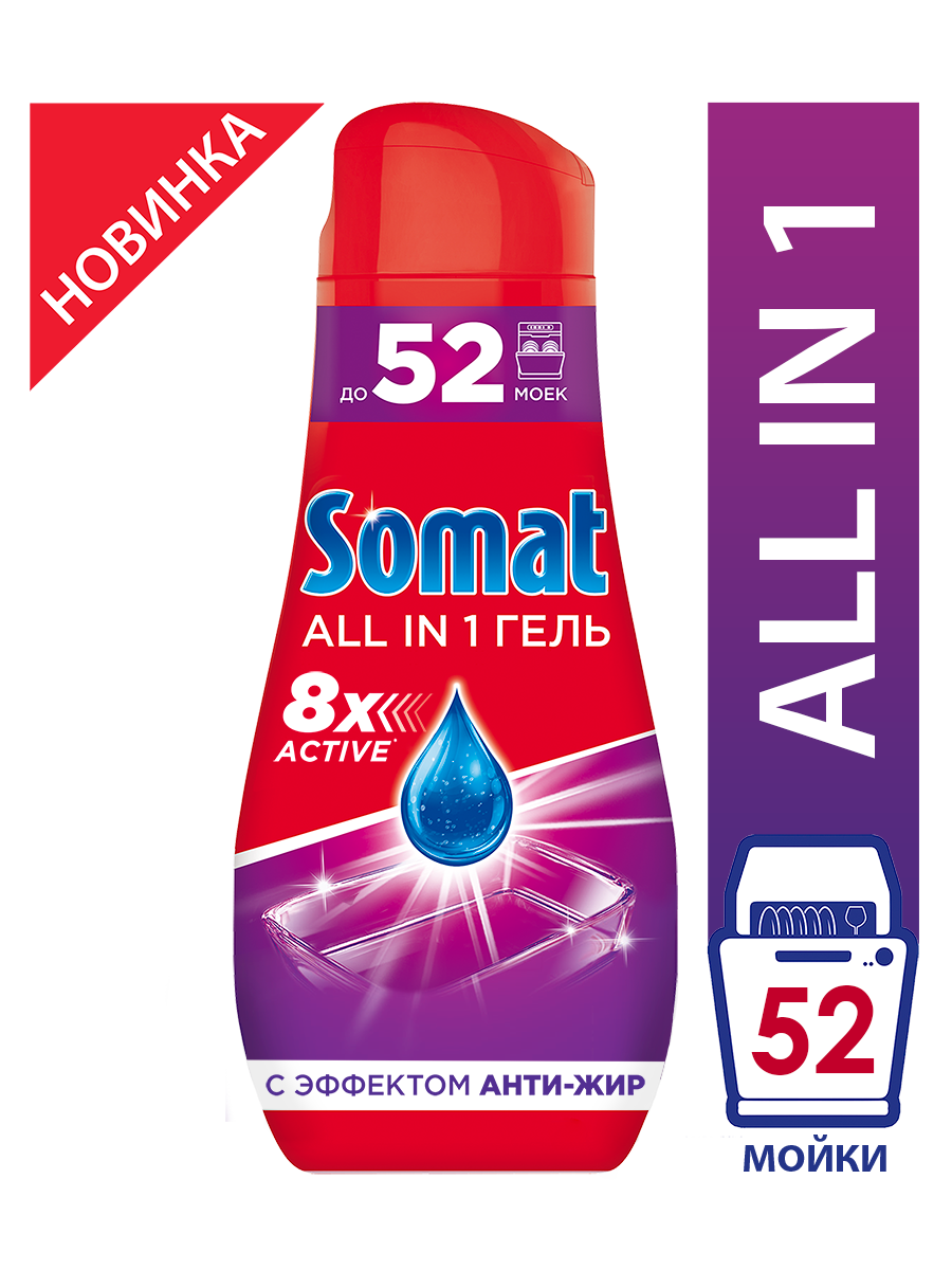 Гель для посудомоечной машины Сомат All in 1 очищает любые загрязнения с посуды и не царапает поверхности. Средство для посуды эффективно работает при температуре 40 ?С. Средство Сомат All in 1 не нуждается в дополнительном использовании соли и ополаскивателя, предохраняет стеклянную посуду от коррозии. Гель для посуды эффективен на коротких циклах без потери качества и уровня чистоты посуды.