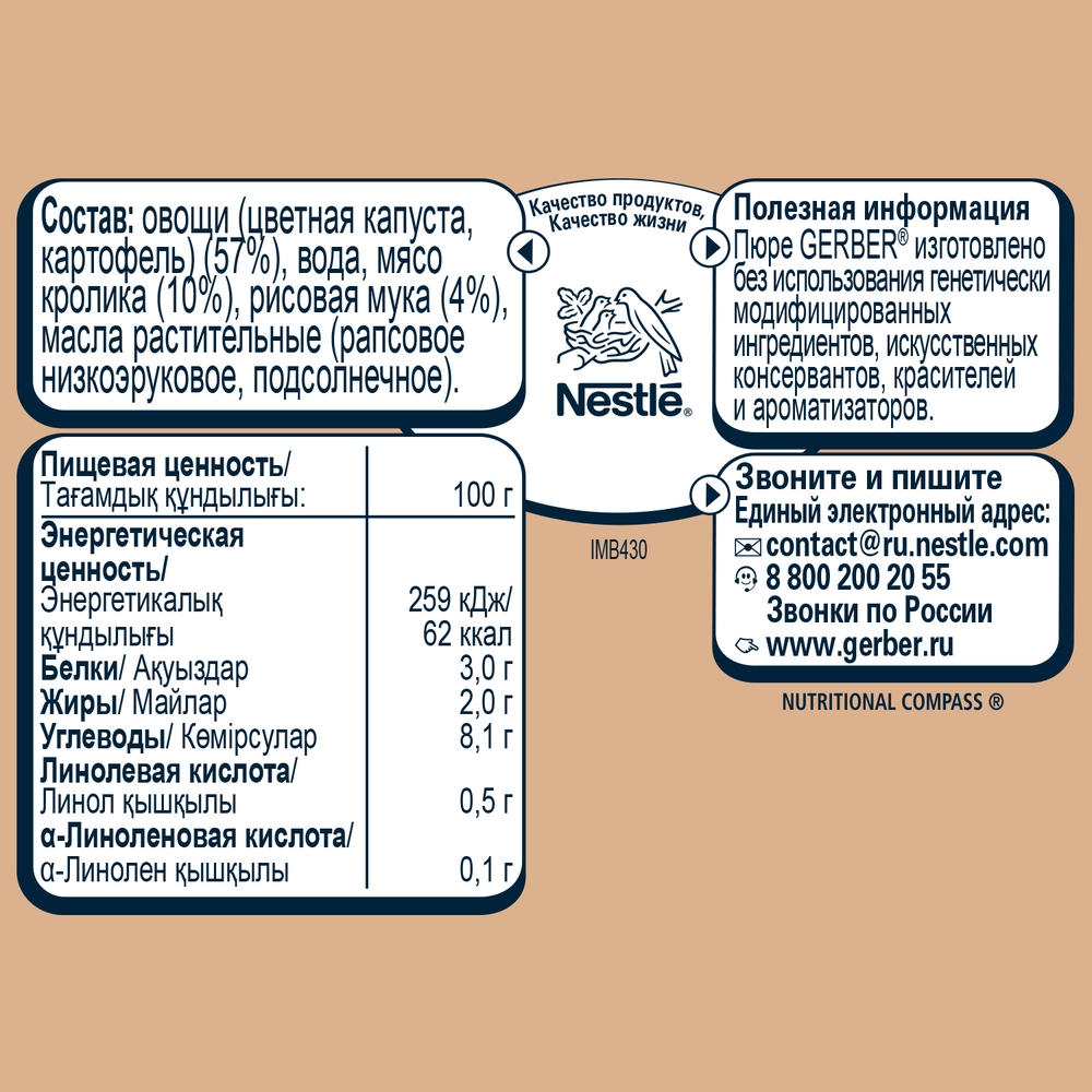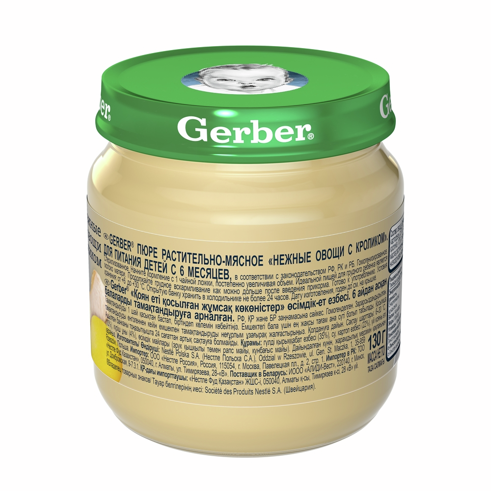 Gerber Нежные овощи с кроликом 130 г. для питания детей старше 6 месяцев согласно законодательству РФ.ВАЖНОЕ ПРИМЕЧАНИЕ: идеальной пищей для грудного ребенка является молоко матери. Всемирная организация здравоохранения рекомендует исключительно грудное вскармливание в первые шесть месяцев и последующее введение прикорма при продолжении грудного вскармливания. Компания Нестле поддерживает данную рекомендацию. Для принятия решения о сроках и способе введения данного продукта в рацион ребенка необходима консультация специалиста.Изготовлено без использования генетически модифицированных ингредиентов, искусственных консервантов, красителей и ароматизаторов. Без добавления крахмала и соли. Содержит Омега 3 и Омега 6.Состав: пюре из цветной капусты (35%), вода, пюре из картофеля (22%), мясо кролика (10%), рисовая мука (4%), растительные масла (низкоэруковое рапсовое, подсолнечное).Пищевая ценность (сред. состав на 100 г): энергетическая ценность - 62 ккал / 261 кДж; белки - 3,0 г; углеводы - 8,1 г; жиры - 2,0 г; линолевая кислота (Омега6) - 0,5 г; -Линоленовая кислота (Омега 3) - 0,1 г.Условия хранения: до вскрытия хранить при температуре от 6 до 30 . Открытую банку хранить в холодильнике не более 24 часов.Внимание! Не использовать продукт, если при открывании не произошло щелчка.Срок годности: Дата изготовления, срок годности см. на крышке.Начните кормление с 1 чайной ложки, постепенно увеличивая объем.Гомогенизированное. Стерилизованное. Готово к употреблению.