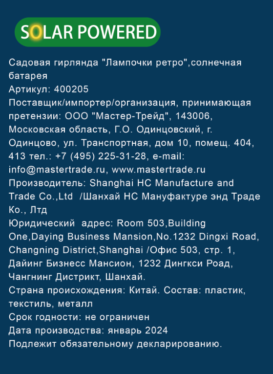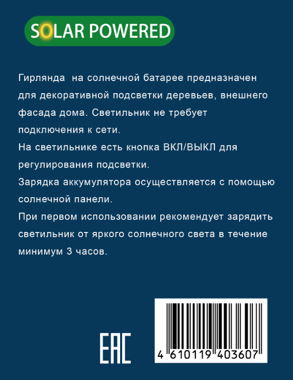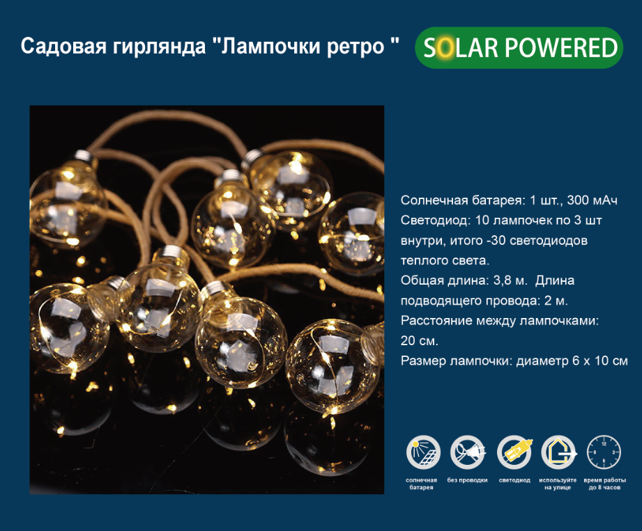 Гирлянда на солнечной батарее предназначена для декоративной подсветки на улице. Не требует подключения к сети, что сильно облегчает его установку. На гирлянде есть кнопка вкл/выкл, переключение режимом для регулирования подсветки в темное время суток. На ленте 10 шт. светодиодных лампочек. Размер светодиодной лампы: диаметр 6 x 10 см. Высота. Провод: 2 м. Расстояние между лампочками: 20см.