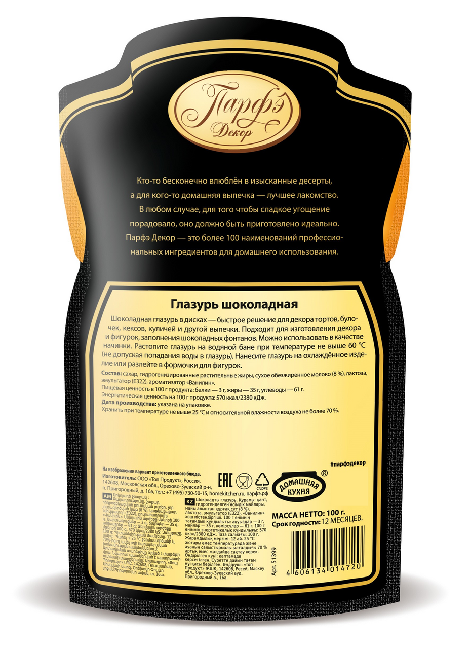 Глазурь Парфэ Шоколадная белая обладает насыщенным вкусом и придает бисквитам, рассыпчатым печеньям, пряникам, эклерам праздничный вид. Продукт растапливается в герметичной упаковке на водяной бане в течение всего лишь 2 минут до оптимальной консистенции, после чего распределяется равномерным слоем по поверхности любого кондитерского изделия. Покрытие не растекается, быстро застывает и может украшаться сахарной мастикой, орехами, маком, ягодами и фруктами. В готовую глазурь также можно добавлять яркие пищевые красители и воздушные кремы на творожной, йогуртовой или сливочной основе для декорирования кексов, порционных капкейков.