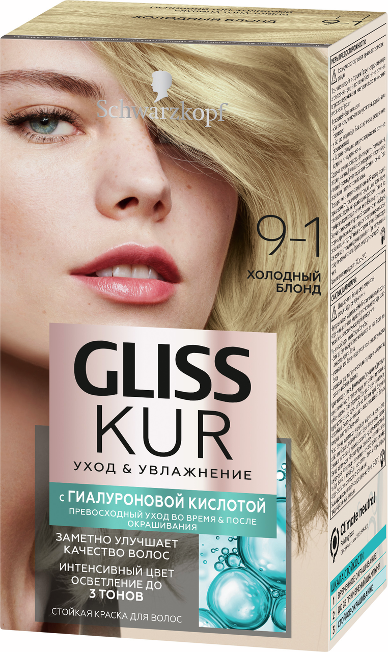 Стойкая краска для волос Глисс Кур Уход и Увлажнение с гиалуроновой кислотой 9-1 Холодный блонд. Превосходный уход во время и после окрашивания. - Заметно улучшает качество волос. - Интенсивный цвет + 100% закрашивание седины. Формула c системой color care delivery глубоко проникает в структуру волоса. Наша стойкая краска c гиалуроновой кислотой, известной своими увлажняющими свойствами, не только защищает волосы, но и ухаживает за ними во время и после окрашивания. Результат: глубокий уход и насыщенный стойкий цвет.
