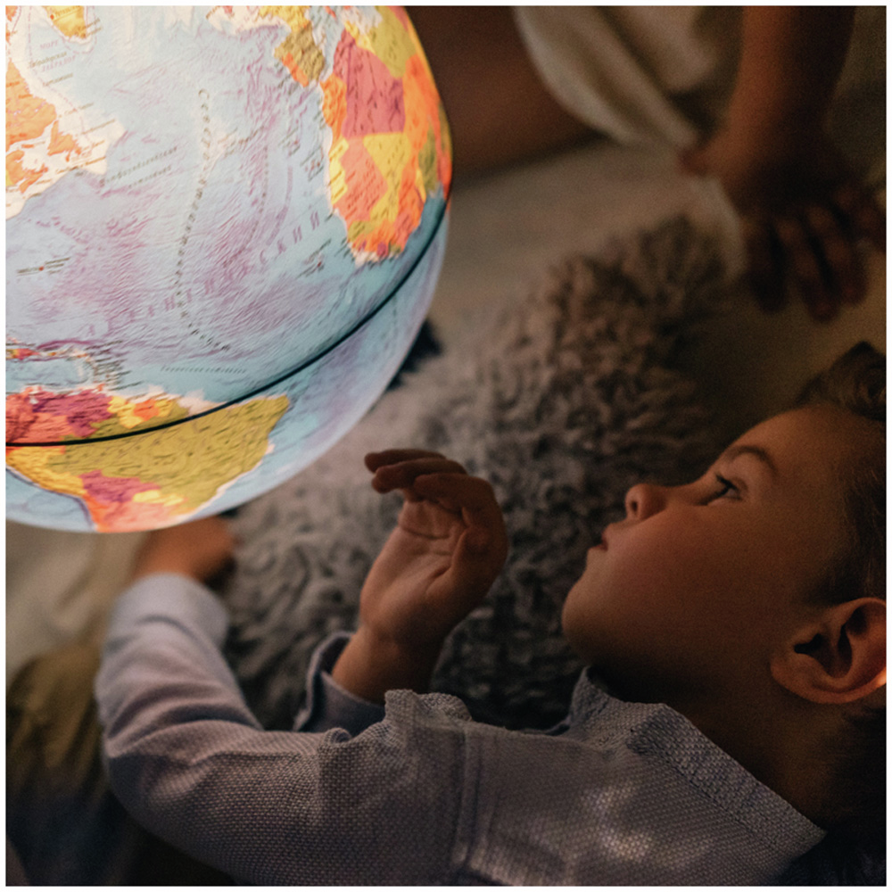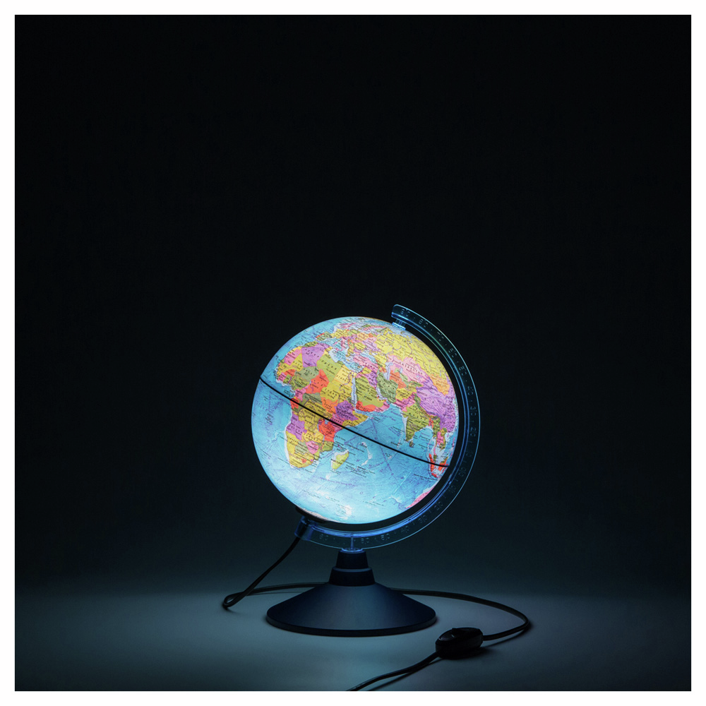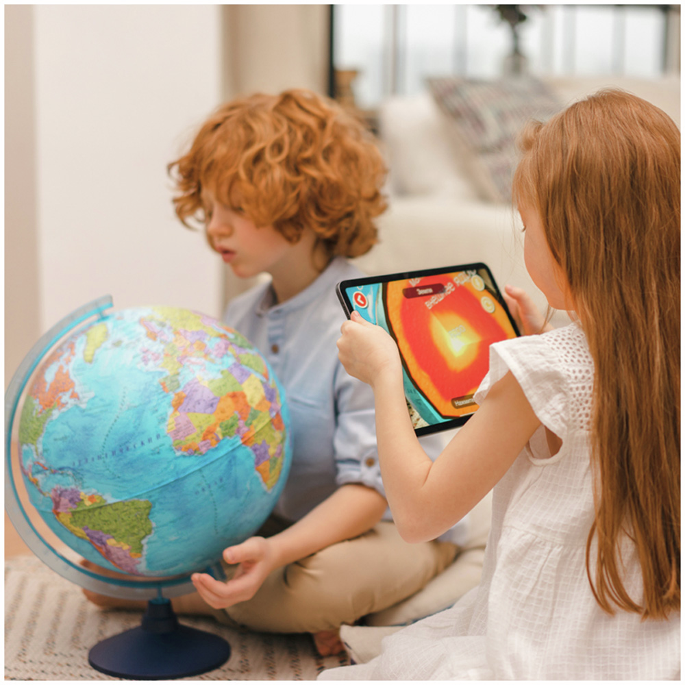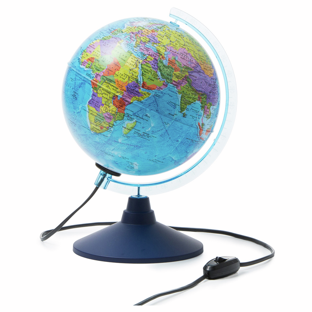 Настольный глобус с политической картой мира и подсветкой будет замечательным подарком для ребенка младшего и среднего возраста, так как не только поможет ему в изучении политической географии, истории, но и послужит интересным украшением интерьера его рабочего стола. Подставка и меридианная дуга из пластика имеют яркий синий цвет, что придает глобусу праздничный вид и выделяет его среди классических аналогов. Подставка устойчивая, что исключает случайное падение глобуса с поверхности стола. В вечернее время или при плохой освещенности можно включить внутреннюю подсветку. Провод надежно изолирован, как у любого качественного светильника, имеет переключатель. Питание от сети в 220 Вольт. Карта максимально подробная для диаметра сферы 25см. Акцент сделан на политико-административном устройстве нашей планеты. Яркими цветами выделены территории стран, границы, согласно стандартам картографии. Легко читаются названия государств, их столиц и значимых городов. Уделено внимание и общегеографическим понятиям - нанесены названия континентов, океанов и их течений, морей, озер, рек, хребтов гор. На глобусе легко ориентироваться, надписи яркие и четкие. Сама сфера выполнена из пластика и оклеена специализированной бумагой. Хотите совершить путешествие в космос, вокруг Земли и даже сквозь века? С интерактивным глобусом Globen почувствовать себя исследователем и ученым сможет каждый. А компанию вам составят обаятельные герои: всезнайка Ариша, ее любознательные братья Тема и Митя и их питомцы — пес Астор и кошка Ириска.
