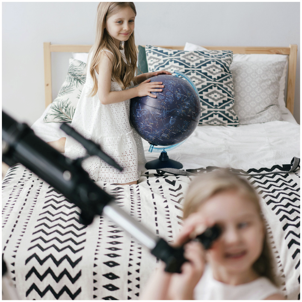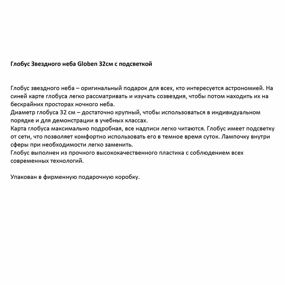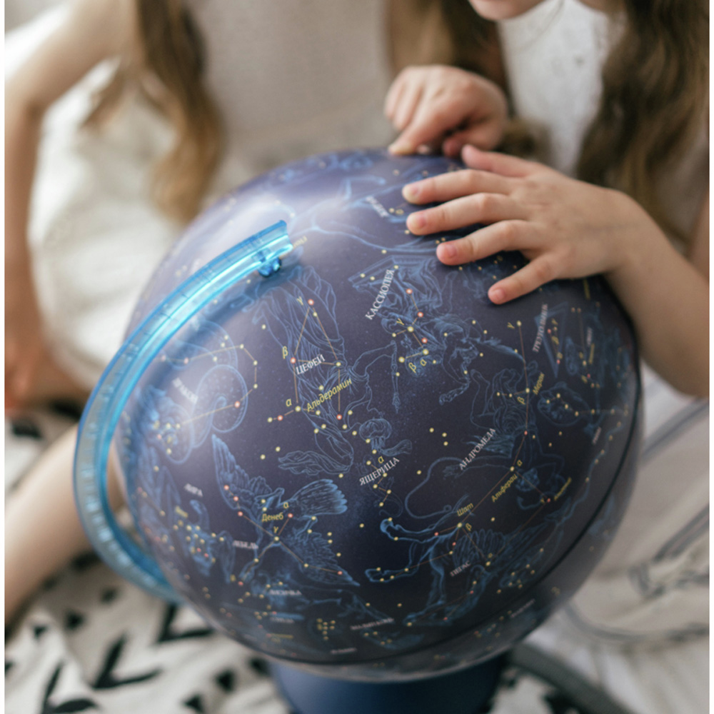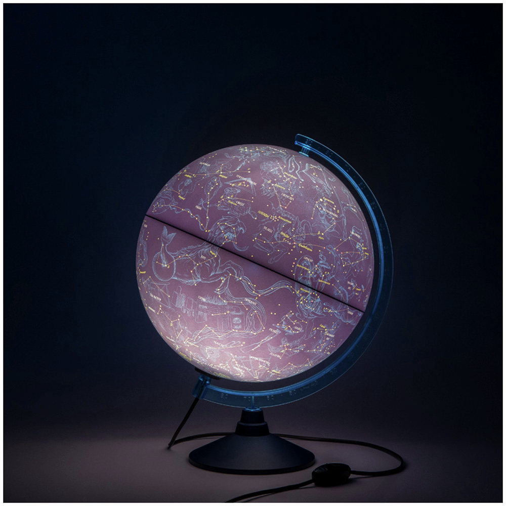 Глобус звездного неба – оригинальный подарок для всех, кто интересуется астрономией. На синей карте глобуса легко рассматривать и изучать созвездия, чтобы потом находить их на бескрайних просторах ночного неба. Глобус имеет подсветку от сети, что позволяет комфортно использовать его в темное время суток. Лампочку внутри сферы при необходимости легко заменить. Глобус выполнен из прочного высококачественного пластика с соблюдением всех современных технологий.