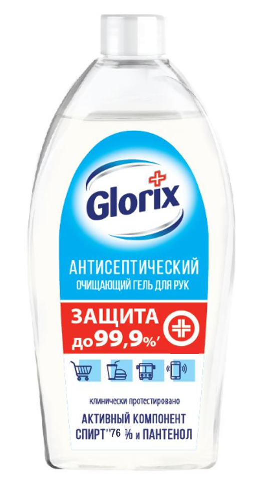 ГЕЛЬ ОЧИЩАЮЩИЙ ДЛЯ РУК GLORIX АНТИСЕПТИЧЕСКИЙЭффективно очищает без воды и уничтожает до 99,9% микробов. Решает проблему гигиены в любое время и в любом месте. Для вашего удобства гель можно перелить в более удобный маленький формат или заправить в дозаторы. Широкий спектр применения: в транспорте, в офисе, на предприятиях общественного питания, дома, после контакта с девайсами.Активные компоненты в составе: изопропиловый спирт 76% об., пантенол. Не содержит отдушек и красителей.Благодаря своим свойствам гель Glorix обладает целым рядом преимуществ:1) Уничтожает 99,9% бактерий2)Антисептический очищающий гель для рук3)Увлажняет кожу4)Содержит в составе Пантенол5)Активная формула со спиртом 76% об.6)Широкий спектр примененияАнтисептический гель для рук Glorix - клинически протестирован, доказана высокая эффективность геля в вопросах сохранения чистоты, гигиены, антибактериальное действие.Также, обладая наиболее высоким содержанием спирта - целых 76% , гель не только оказывает антибактериальное действие, но и не сушит кожу, так как в его составе содержится Панетнол.Антисептический гель для рук Glorix эффективно уничтожает 99,9% бактерий, при этом не оказывая сильное негативное воздействие на кожу рук,. компенсируя его своим уникальным составом - а именно содержанием в нем Пантенола, который увлажняет кожу рук.Благодаря таким свойствам, Антисептический гель для рук Glorix является незаменимым средством в борьбе с бактериями на коже и сохранении их всегда в чистоте, даже не имея доступа к воде.null по результатам клинического ин-витро теста, гель уничтожает до 99.9% Escherichia Coli, Staphylococcus aureus, Pseudomonas aeruginosa, Candida albicans, УрНИИДВиИ, РФ, 2020.null изопропиловый спирт.