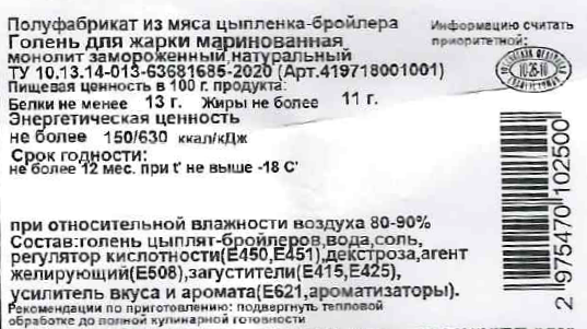 Голень цыплят-бройлеров, вода, соль, регулятор кислотности Е450, Е451, декстроза, агент желирующий Е508, загустители Е415, Е425, усилитель вкуса и аромата Е621, ароматизаторы.