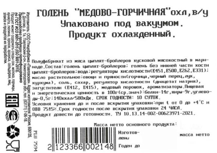 Голень цыплят-бройлеров, голень без нижней части кости цыплят-бройлеров, вода, масло подсолнечное, овощи и пряности горчица, черный перец, куркума, соль, сахар, регуляторы кислотности Е262, Е331, Е451, Е500, загустители Е412, Е415, медовый, порошок, ароматизаторы, антиокислитель Е301.