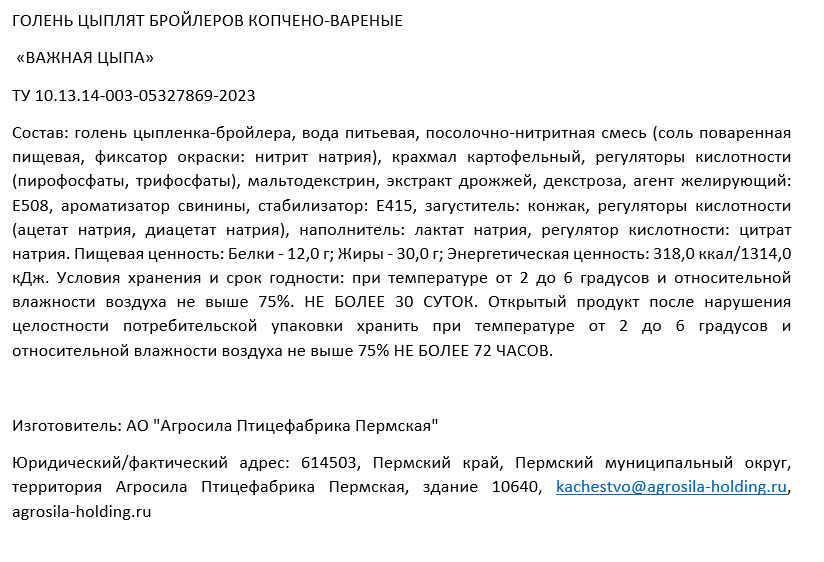 Голень цыпленка-бройлера, вода питьевая, посолочно-нитритная смесь (соль поваренная пищевая, фиксатор окраски: нитрит натрия), крахмал картофельный, регуляторы кислотности (пирофосфаты, трифосфаты), мальтодекстрин, экстракт дрожжей, декстроза, агент желирующий: Е508, ароматизатор свинины, стабилизатор: Е415, загуститель: конжак, регуляторы кислотности (ацетат натрия, диацетат натрия), наполнитель: лактат натрия, регулятор кислотности: цитрат натрия.