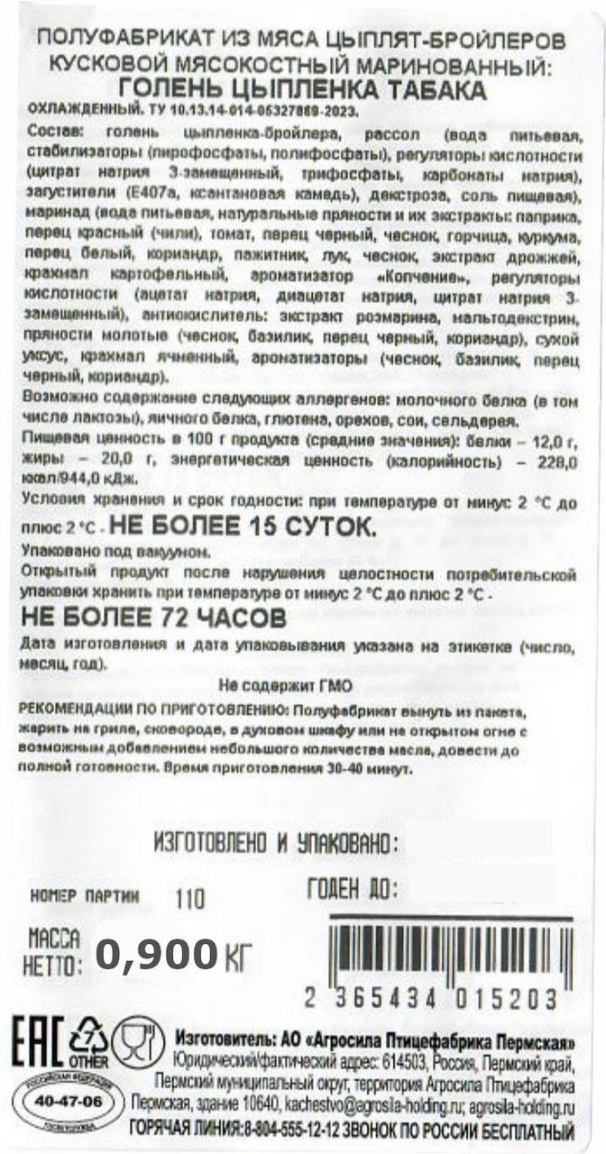 Голень цыпленка-бройлера, рассол (вода питьевая, стабилизаторы (пирофосфаты, полифосфаты), регуляторы кислотности (цитрат натрия3-замещенный, трифосфаты, карбонаты натрия), загустители (Е407а, ксантановая камедь), декстроза, соль пищевая), маринад (водапитьевая, натуральные пряности и их экстракты (паприка, перец красный (чили), томат, перец черный, чеснок, горчица, куркума, перецбелый, кориандр, пажитник, лук, чеснок), экстракт дрожжей, соль, крахмал картофельный, ароматизатор Копчение, регуляторыкислотности (ацетат натрия, диацетат натрия, цитрат натрия 3-замещенный), антиокислитель: экстракт розмарина, мальтодекстрин,пряности молотые (чеснок, базилик, перец черный, кориандр), сухой уксус, крахмал ячменный, ароматизаторы (чеснок, базилик, перецчерный, кориандр).