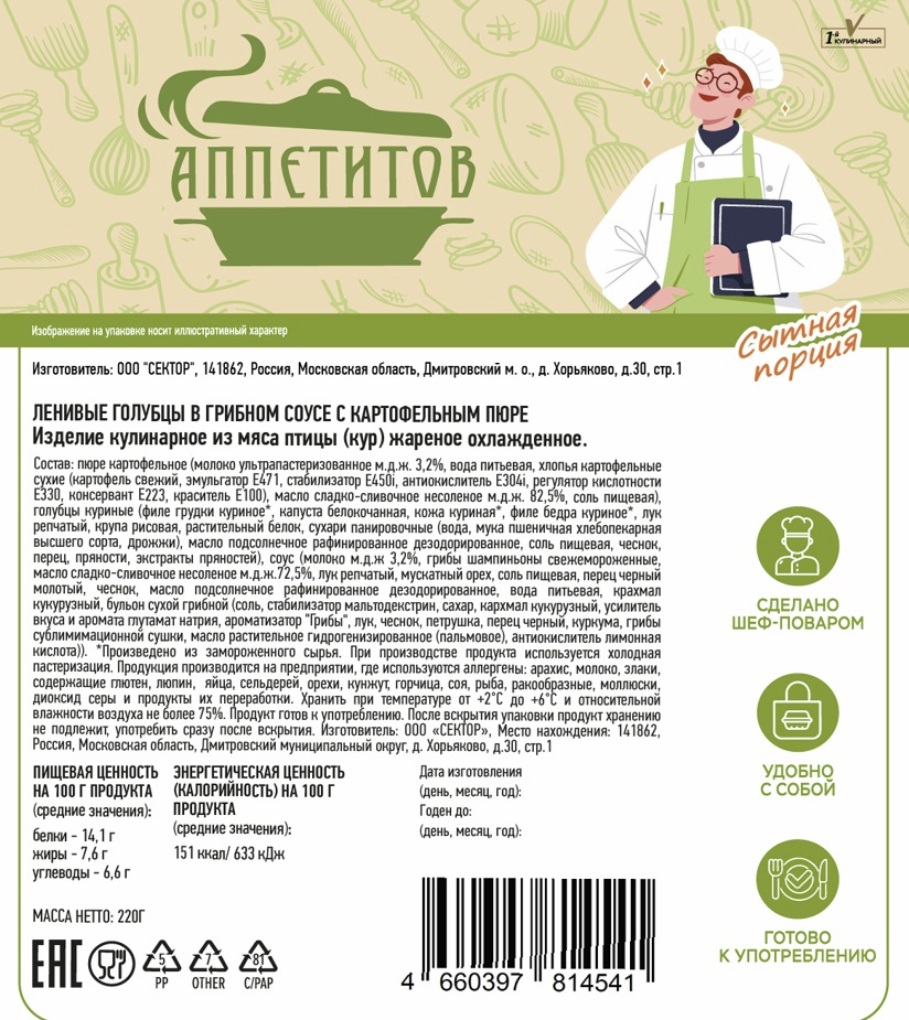Голубцы ленивые Аппетитов в грибном соусе с картофельным пюре, 220г